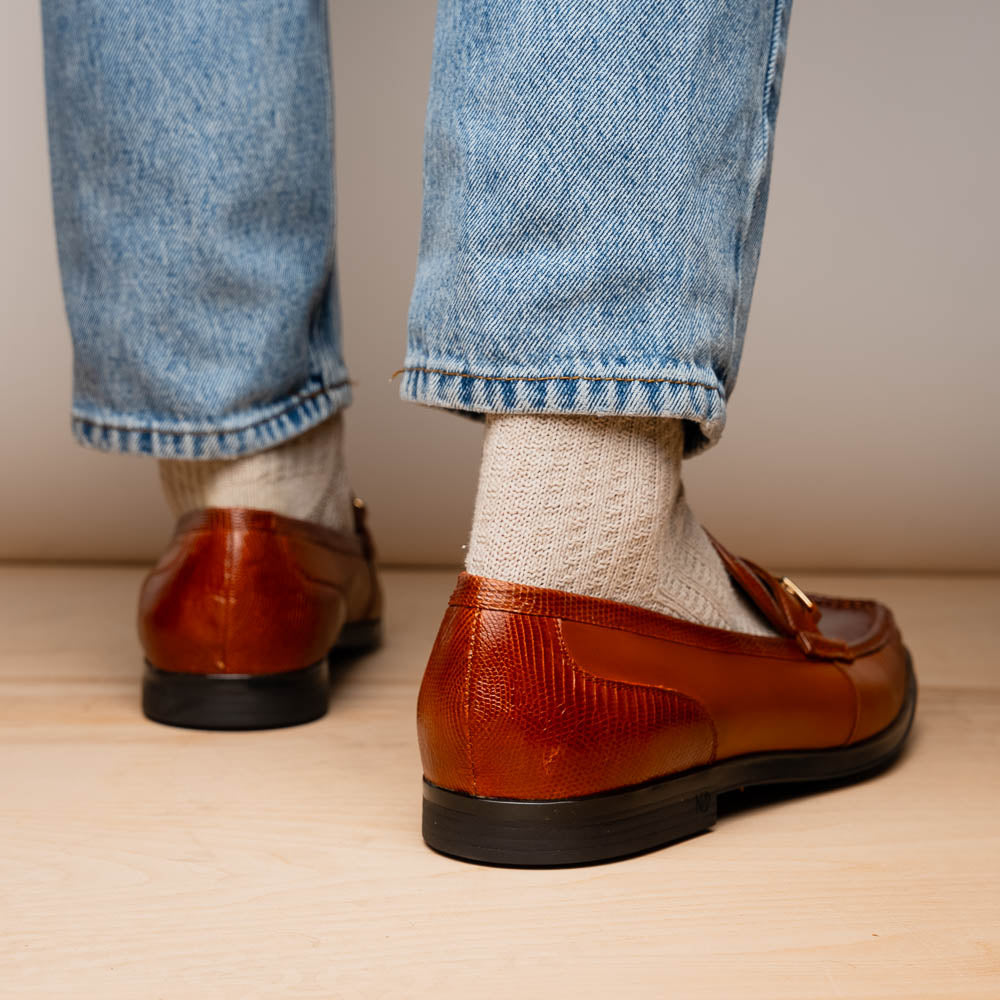 The RAVELLO is our stylish fully genuine lizard and smooth calfskin bit loafers sporting a branded silver tone metal bit, a beautiful polished hand finish, and durable and comfortable rubber outsole. Dress these up with your favorite jeans or slacks for a sophisticated look.
