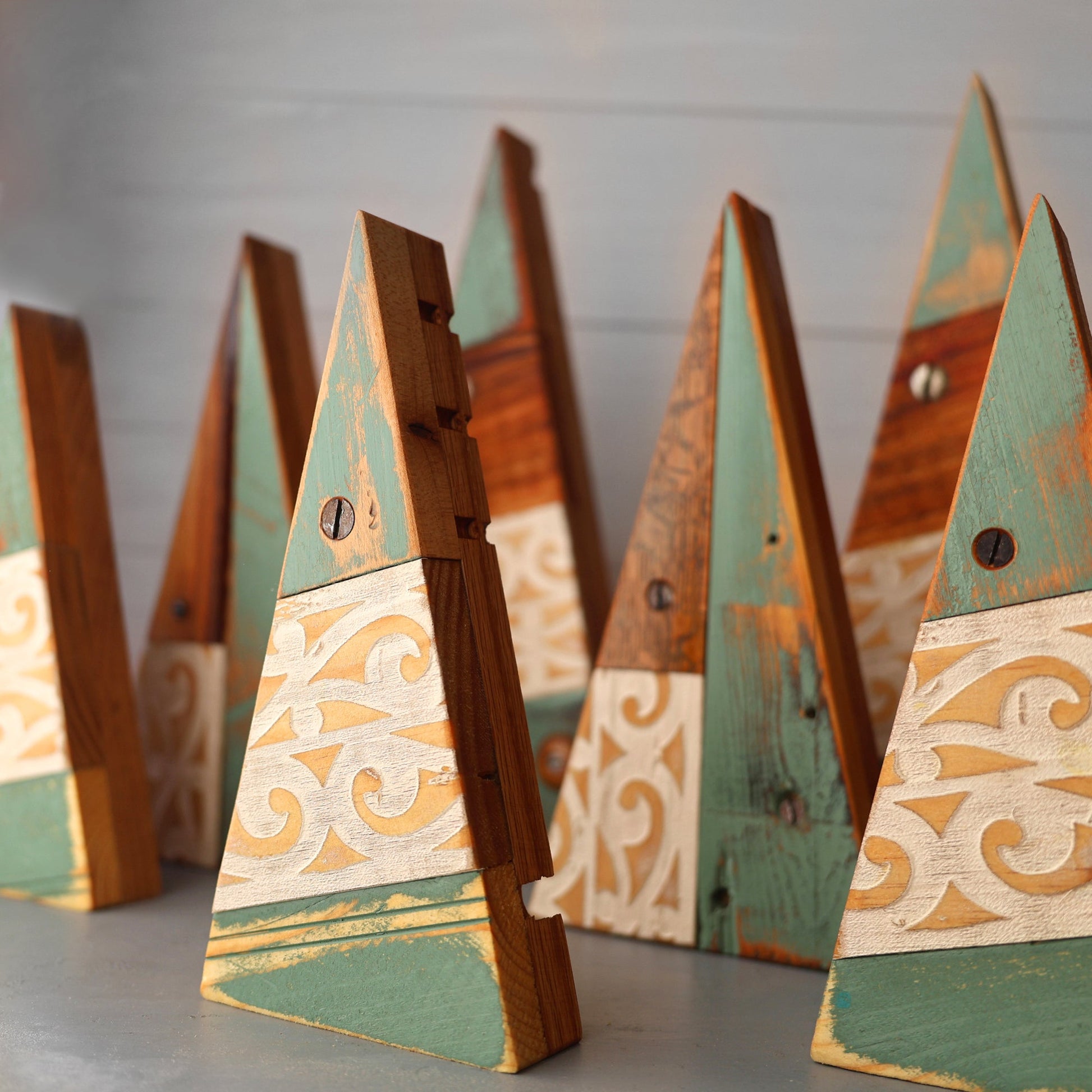 These adorable trees are handcrafted with reclaimed piano and other antique furniture woods. Each is made with various woods to achieve an eclectic look—no two are exactly alike! These beautiful Christmas Trees are wonderful gifts.