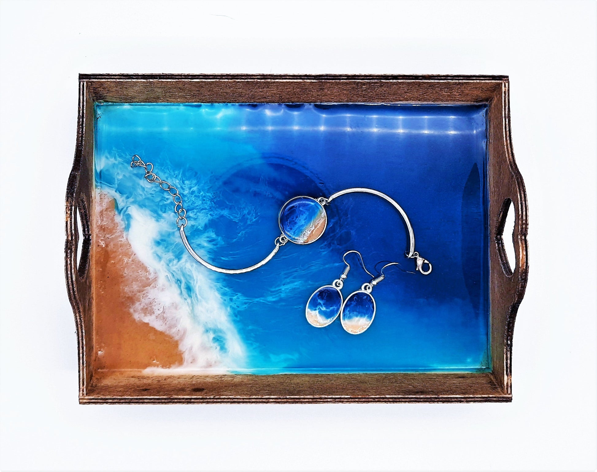 Epoxy Resin Seascape Coastal Wave Beach Scene Small Wooden Jewelry Tray/ Trinket Tray / Made with REAL Sand, Alcohol Inks, and Mica. Super lightweight.