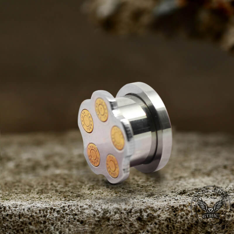 The revolver-shaped ear stretching is unique and dangerous. Now, revolvers have become synonymous with wheel guns. Specially, the magazine only has five rounds, but it's enough to be noticed. Friends who like these revolver magazine ear gauges should not miss it.