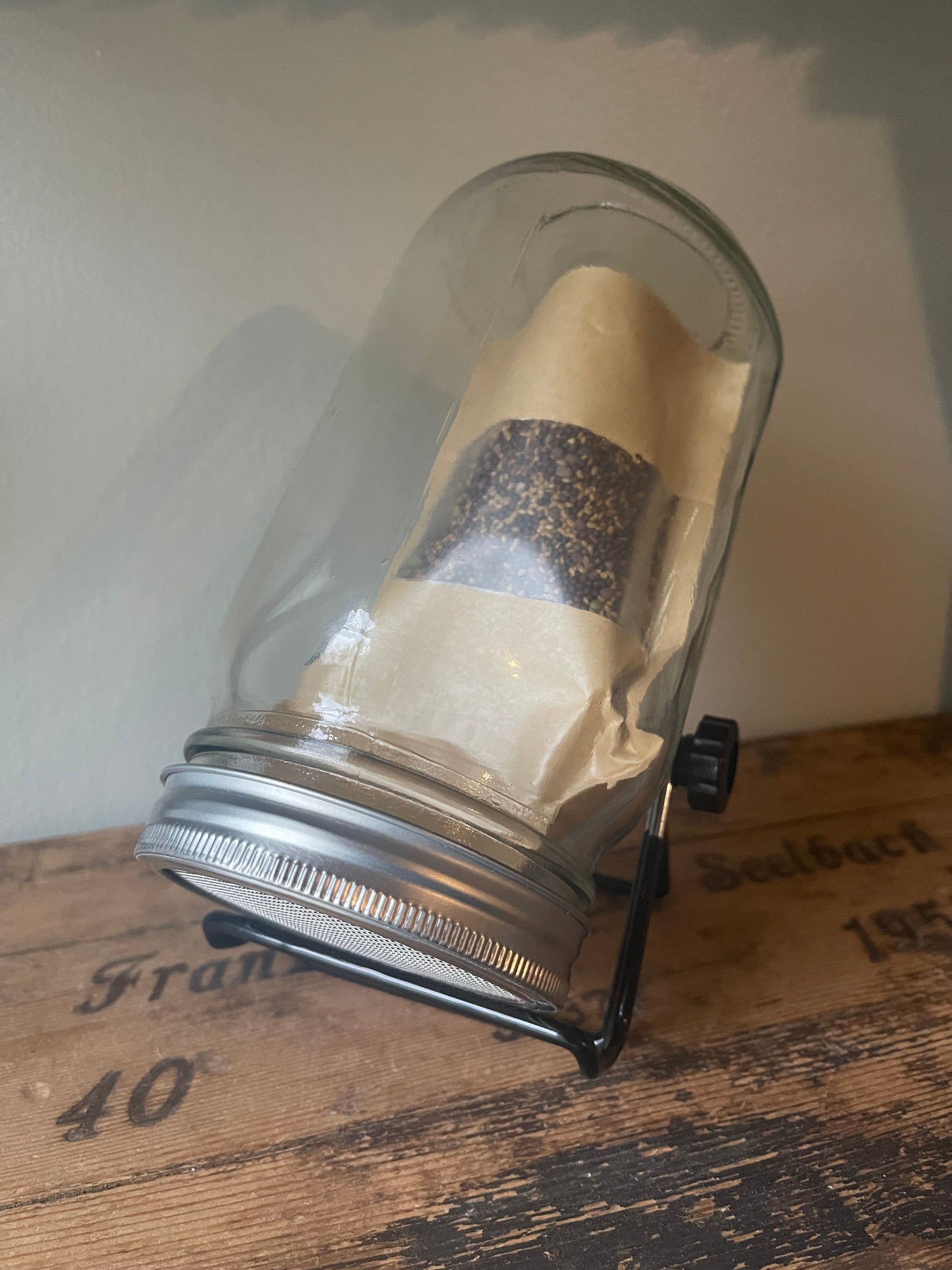 after 4-5 days, replace mesh lid with airtight lid and store in fridge when sprouts are dry.