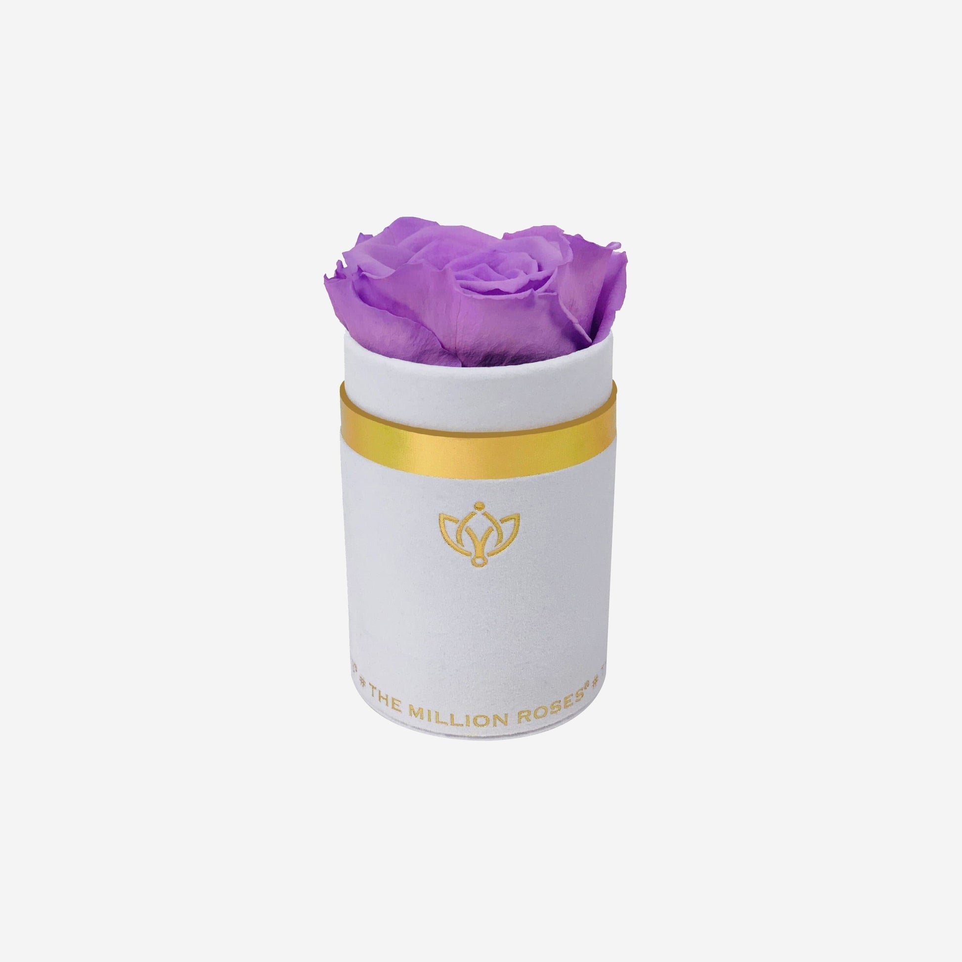 One rose says it all in this white suede box adorned with a gorgeous and long-lasting lavender rose.