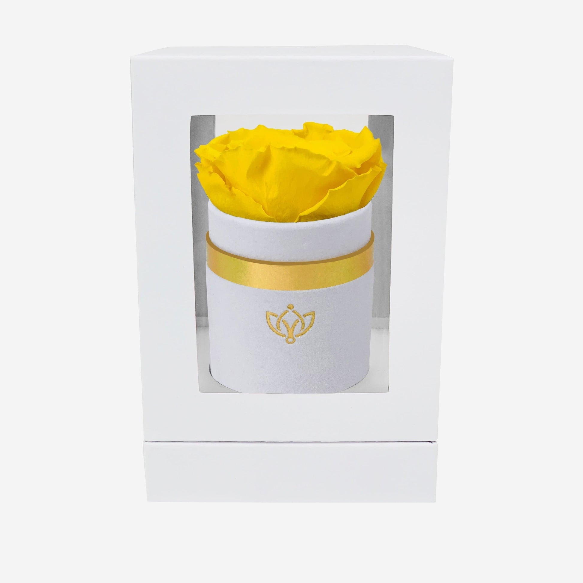 One rose says it all in this white suede box adorned with a gorgeous and long-lasting yellow rose.