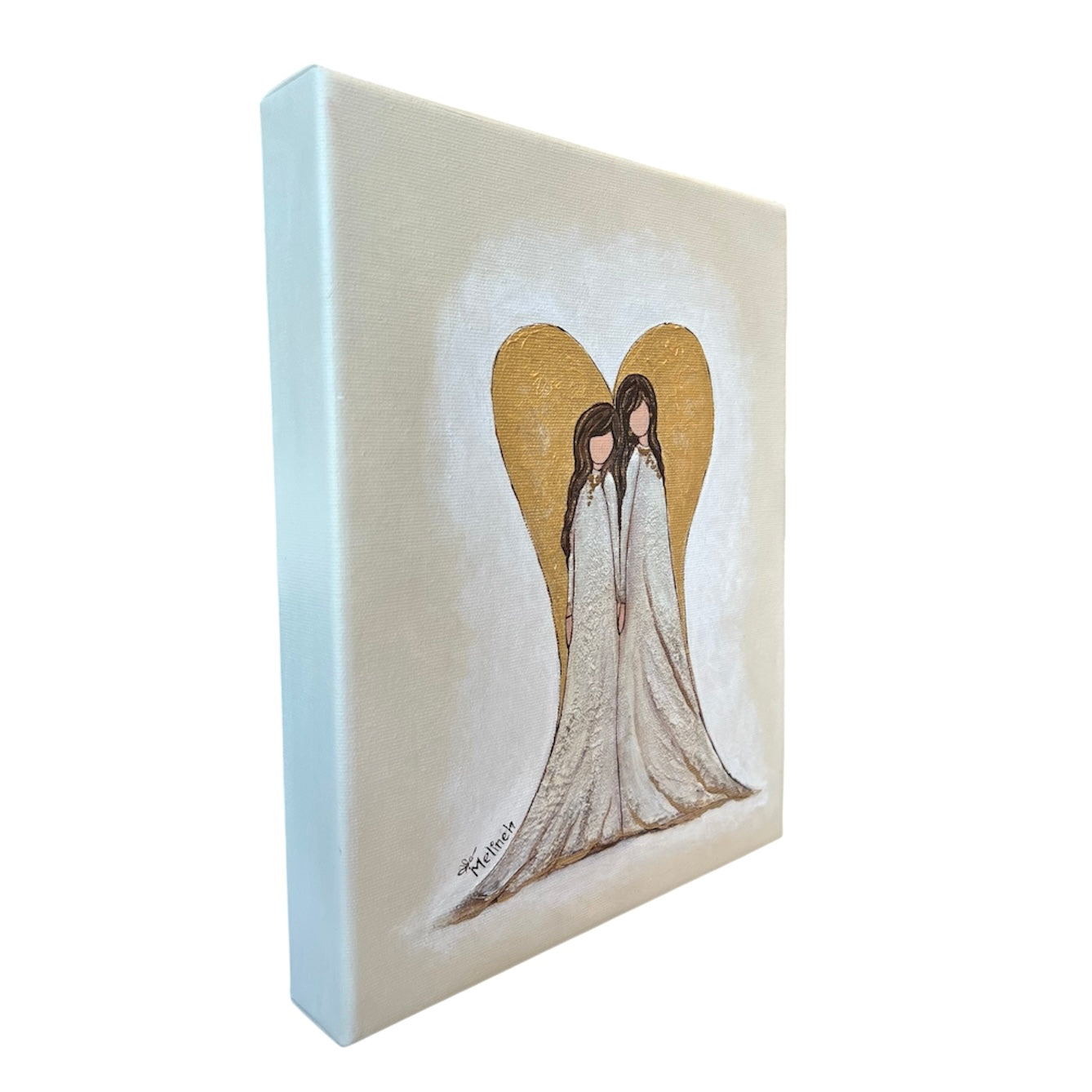 Decorate with love and elegance with this 8"x10" canvas painting featuring a beautiful relationship between two female figures. Their stunning dresses adds a touch of style and the gold accents provide a lux finish. This captivating artwork is a perfect blend of grace and warmth, making it an inspiring addition to your collection or a thoughtful gift for someone special. Mixed media canvas