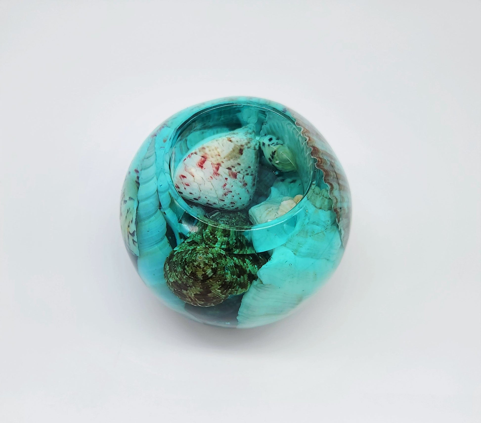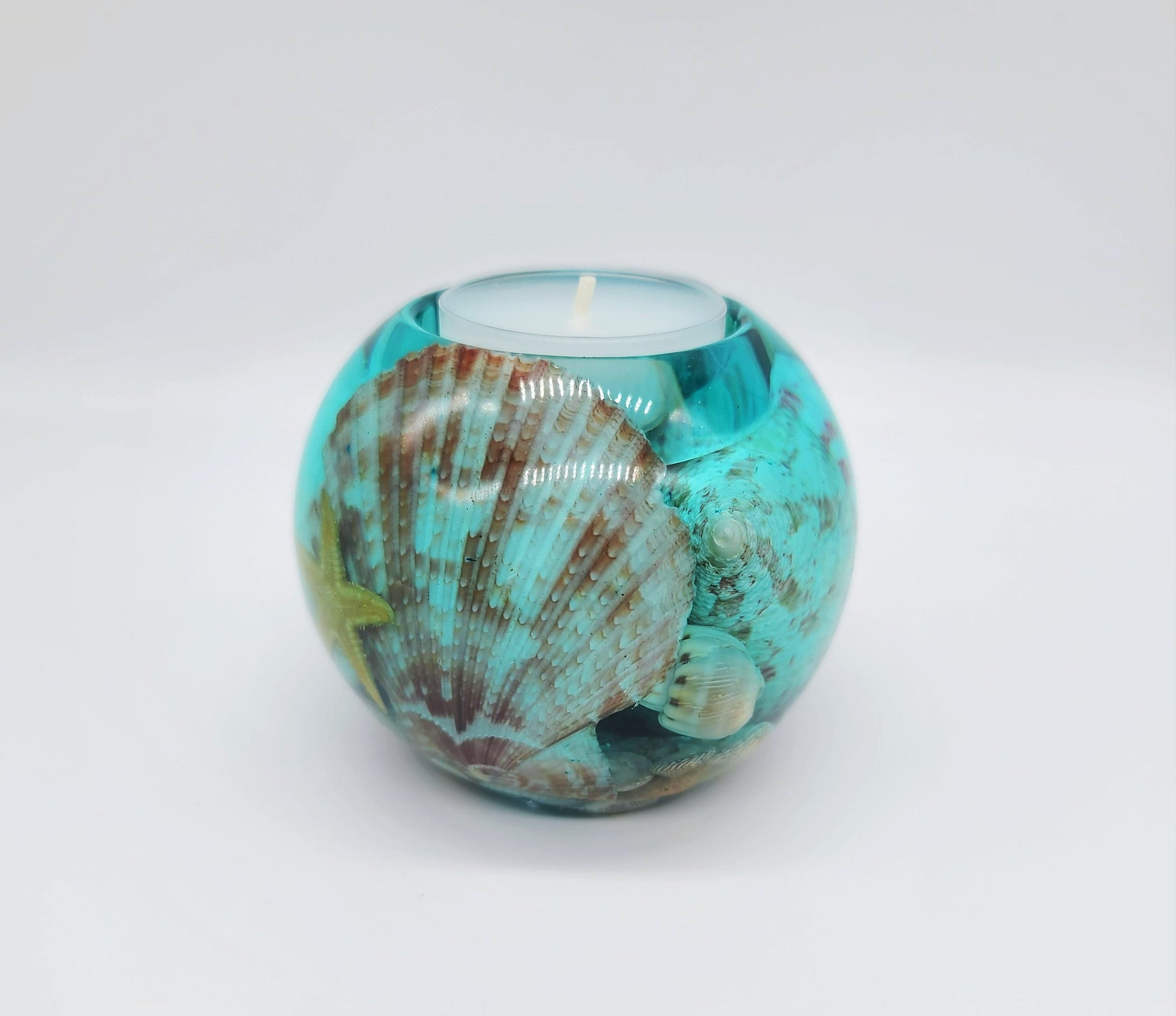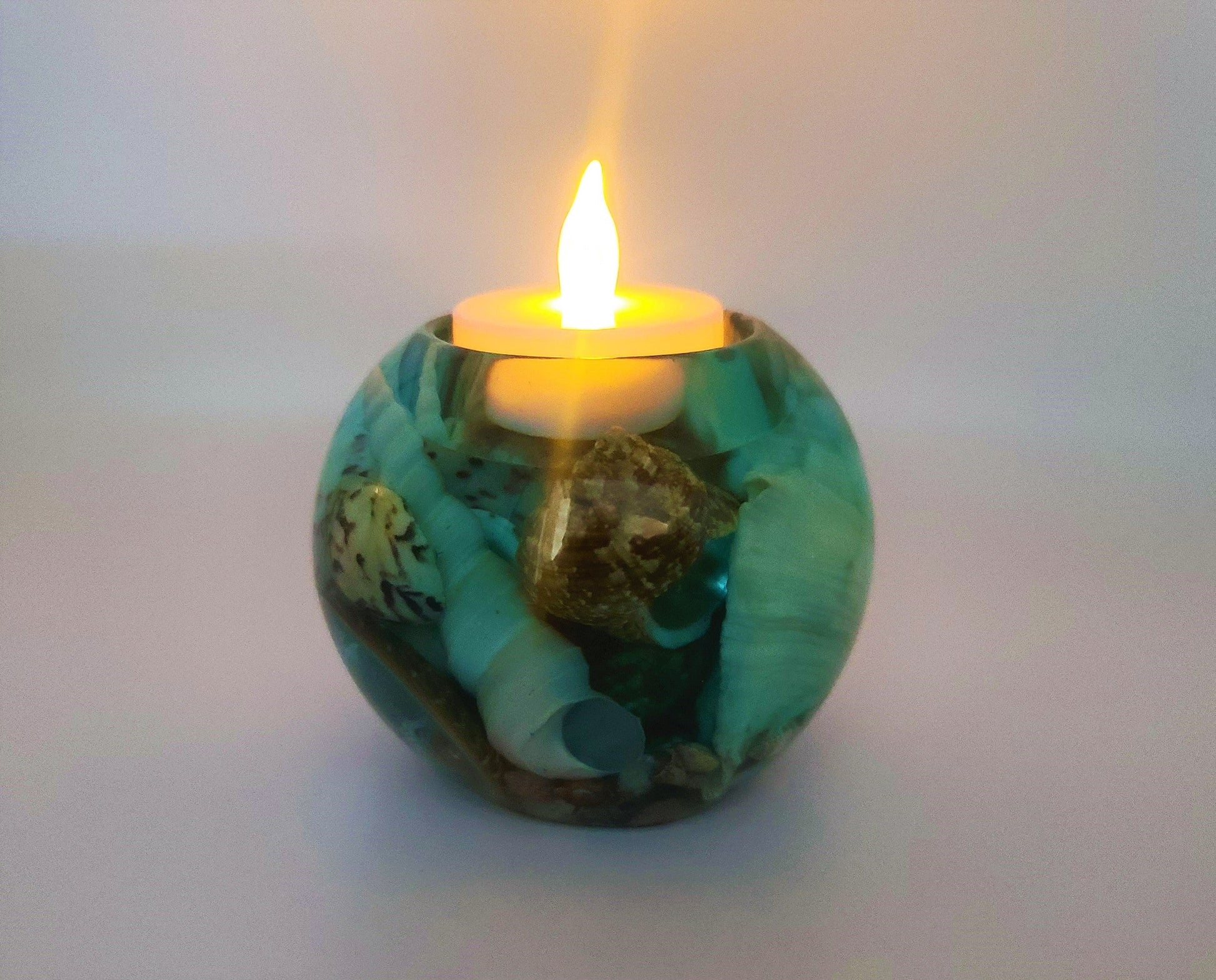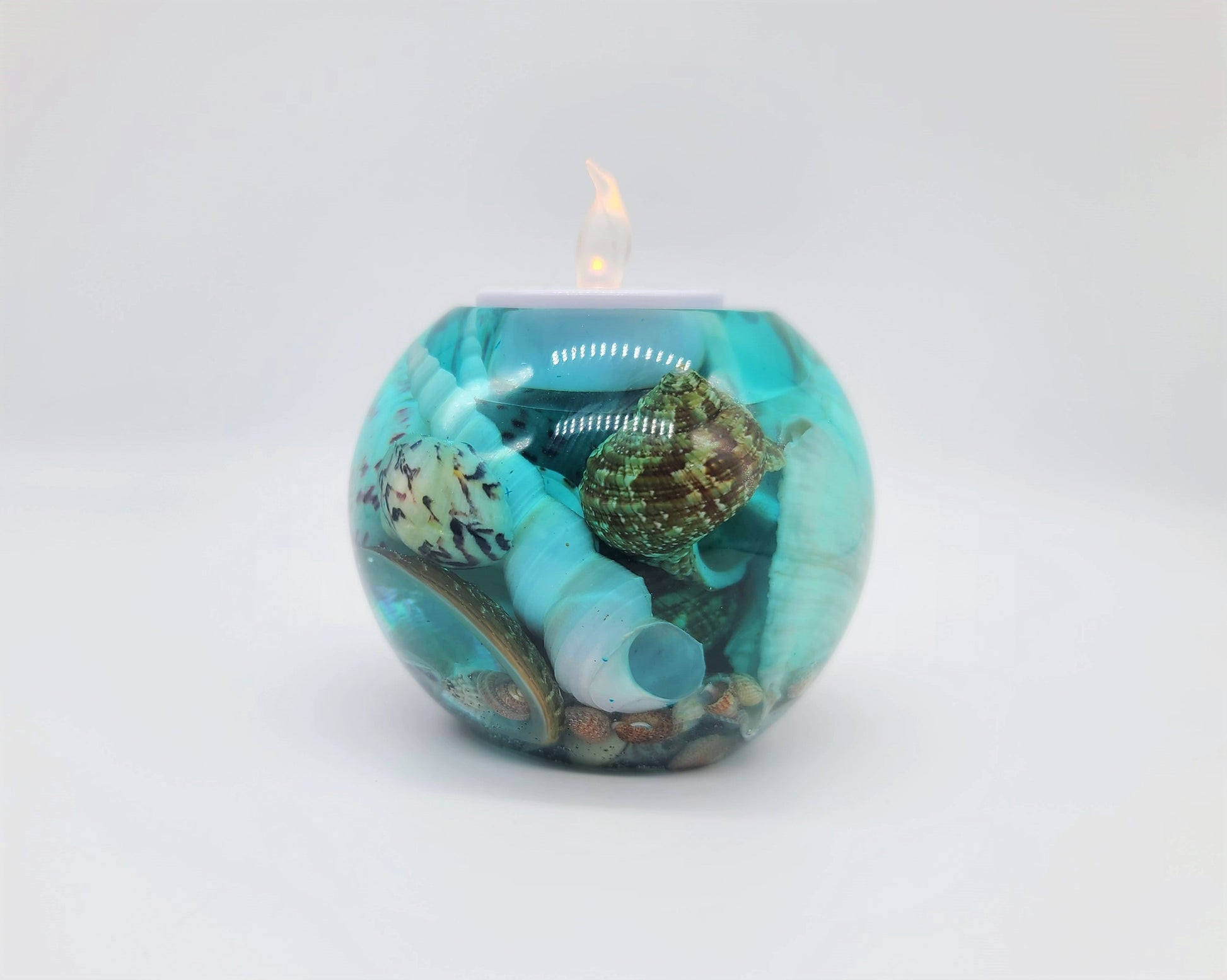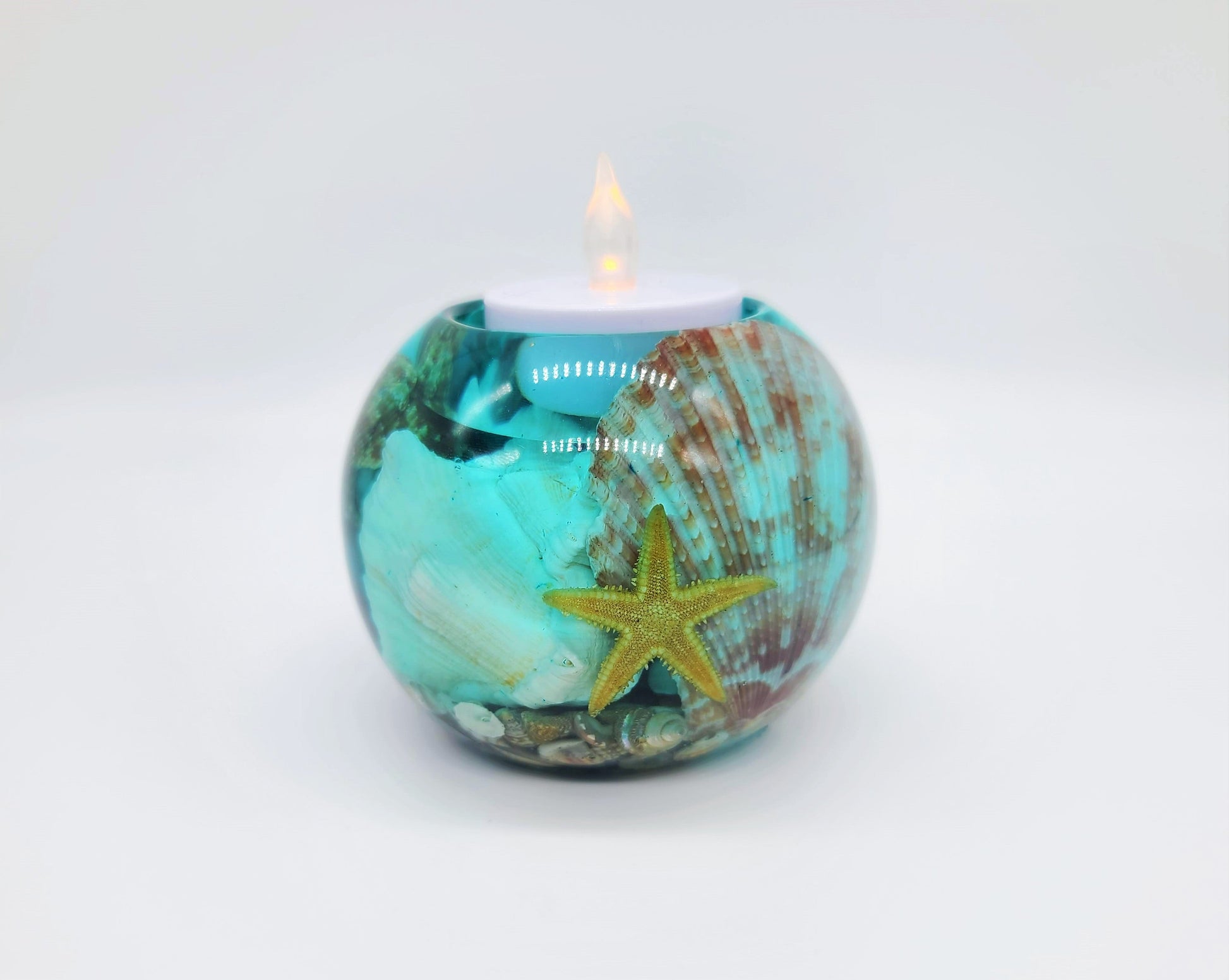 Small Spherical / Round Seascape Candle Holder Made with Eco-Friendly Epoxy Resin & Seashells - Includes Real Tealight or LED Tealight.
