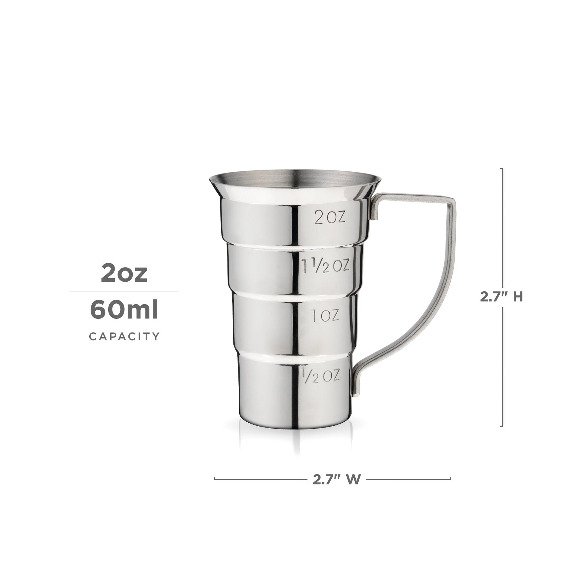 Take your barware to the next level with the Stainless Steel Stepped Jigger. With 4 measurements and external markings, this stepped jigger is a stylish and ultra-functional addition to your barware. The stainless steel finish evokes professional cocktail bar tools, while the handle lets you measure quickly and accurately, no flipping around necessary.