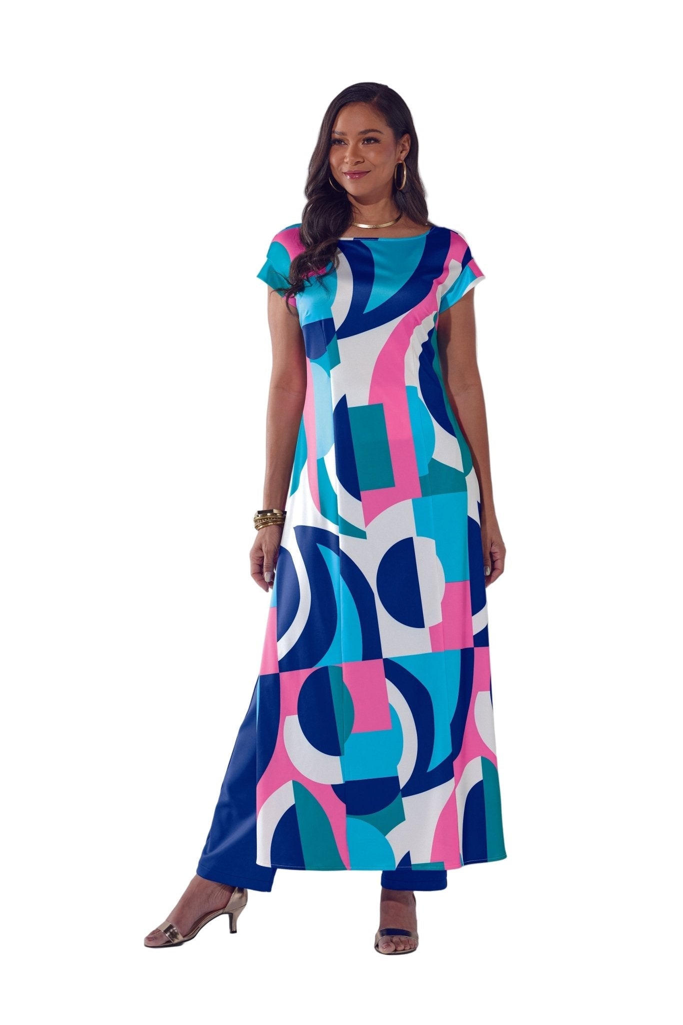 Adorn yourself in effortless style with the Sheerly Floral Blue Shirtdress. This two-piece set features a vibrant, multi-color palette in a smooth knit that drapes beautifully for a flattering silhouette. The 54-inch short-sleeve top is designed with side slits from the high point of the shoulder, adding a touch of graceful movement. The matching 30-inch inseam pants feature a comfortable side zipper and an elastic waist for a perfect fit.