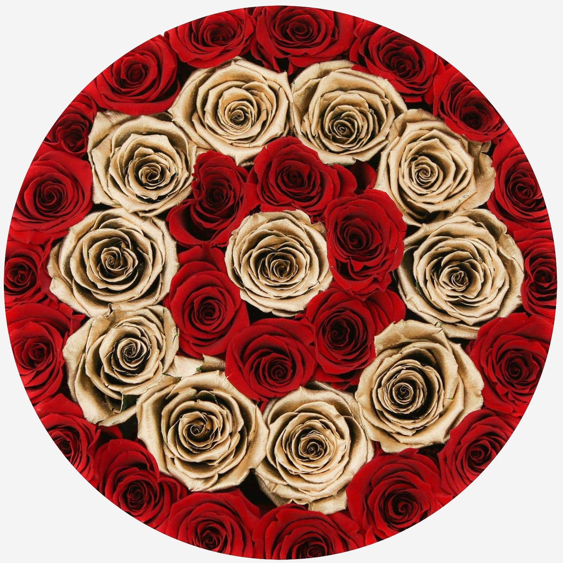 The arrangement showcases red and 24K gold preserved roses with an outstanding natural appearance in one of our incredible hand-crafted black boxes.