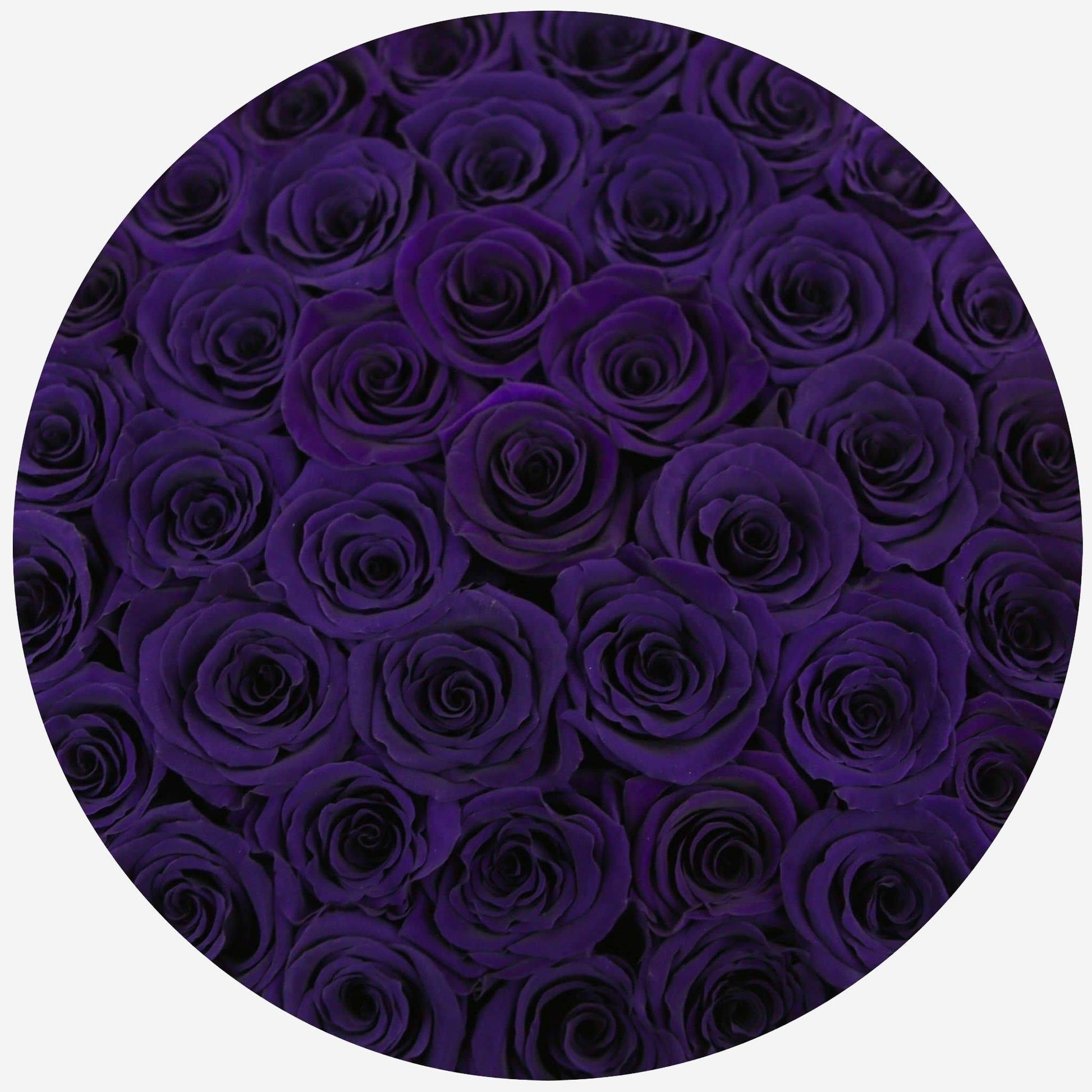 The arrangement showcases dark purple preserved roses with an outstanding natural appearance in one of our incredible hand-crafted white boxes.