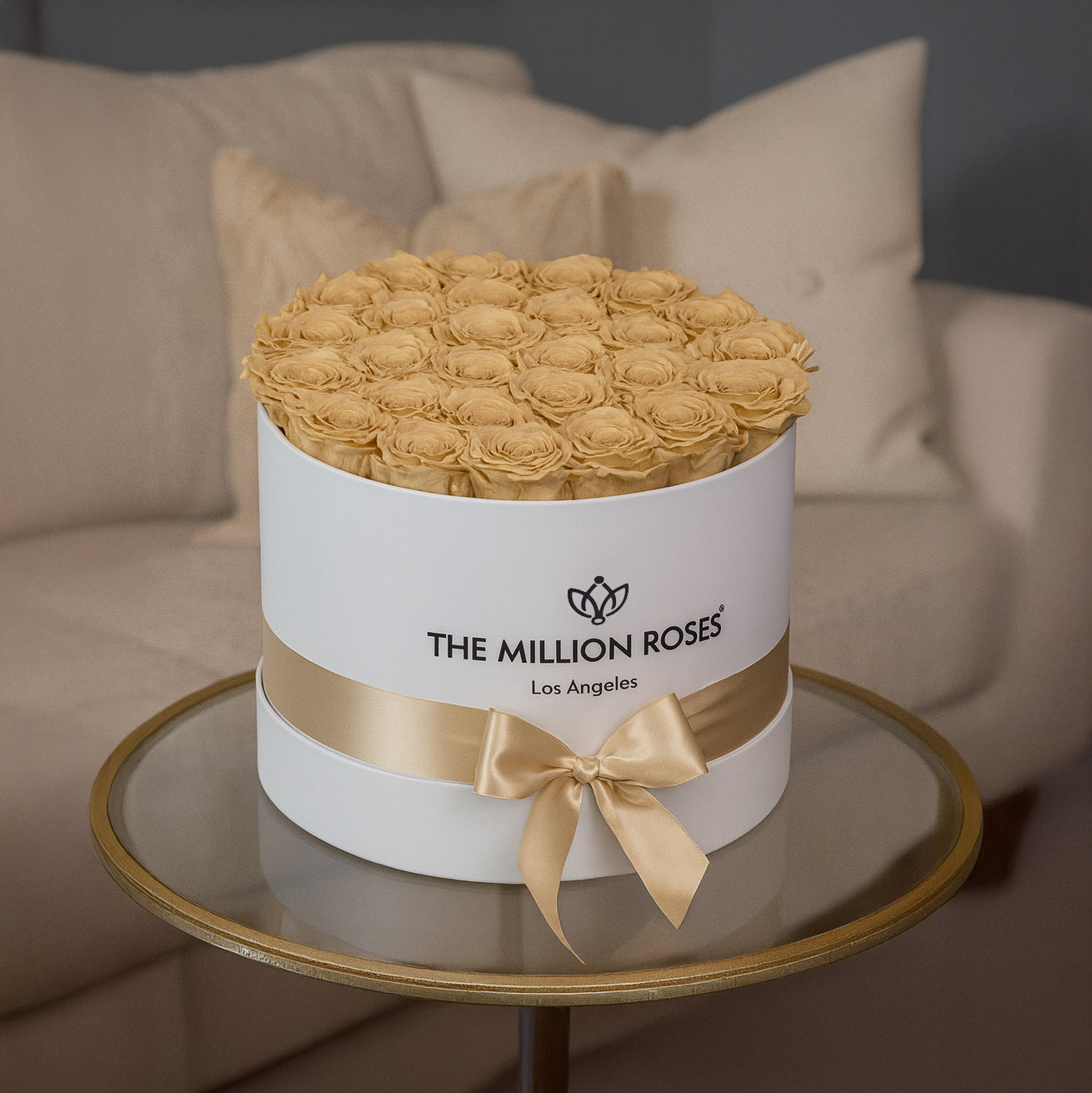 The arrangement showcases sand preserved roses with an outstanding natural appearance in one of our incredible hand-crafted white boxes.