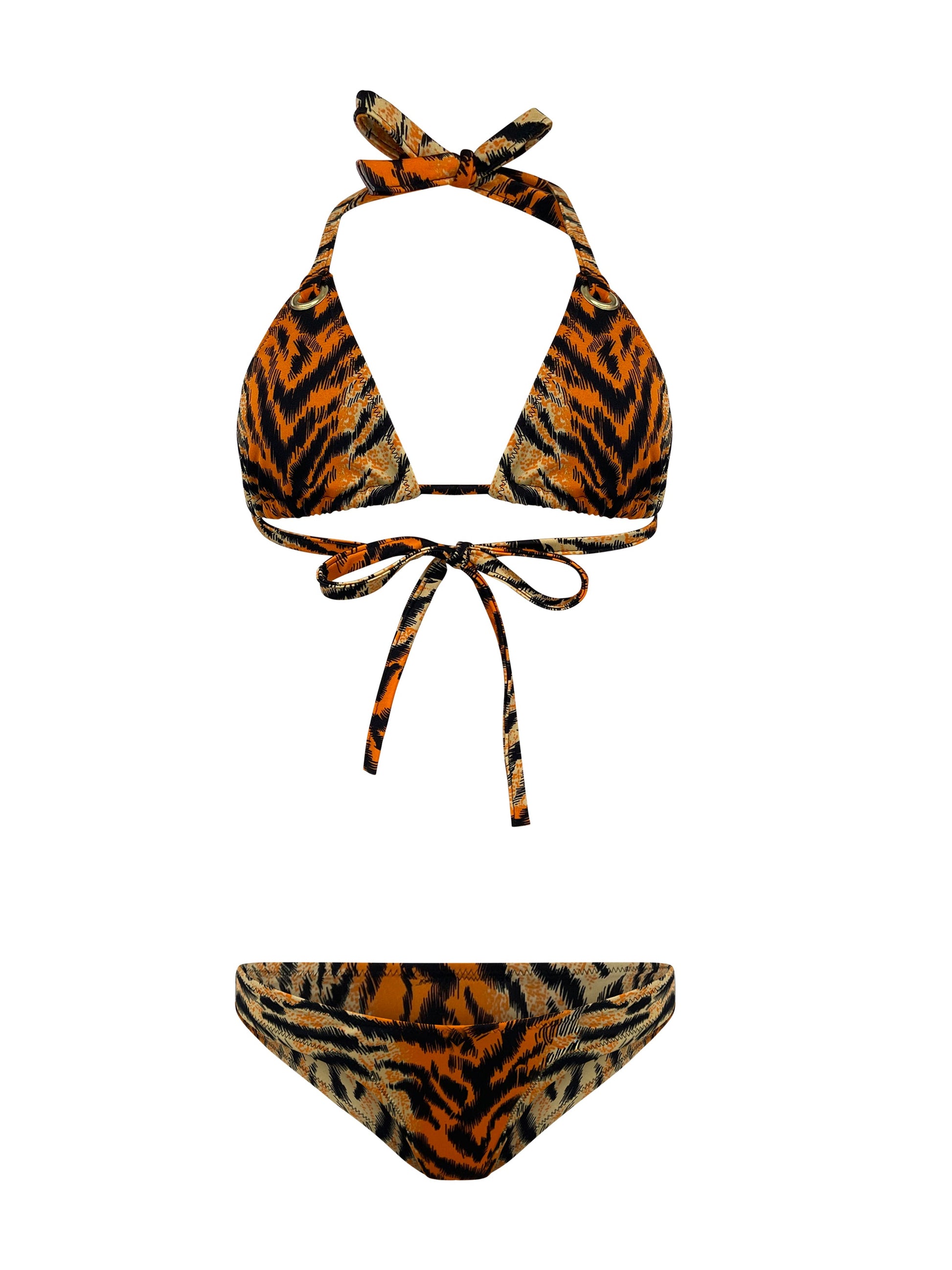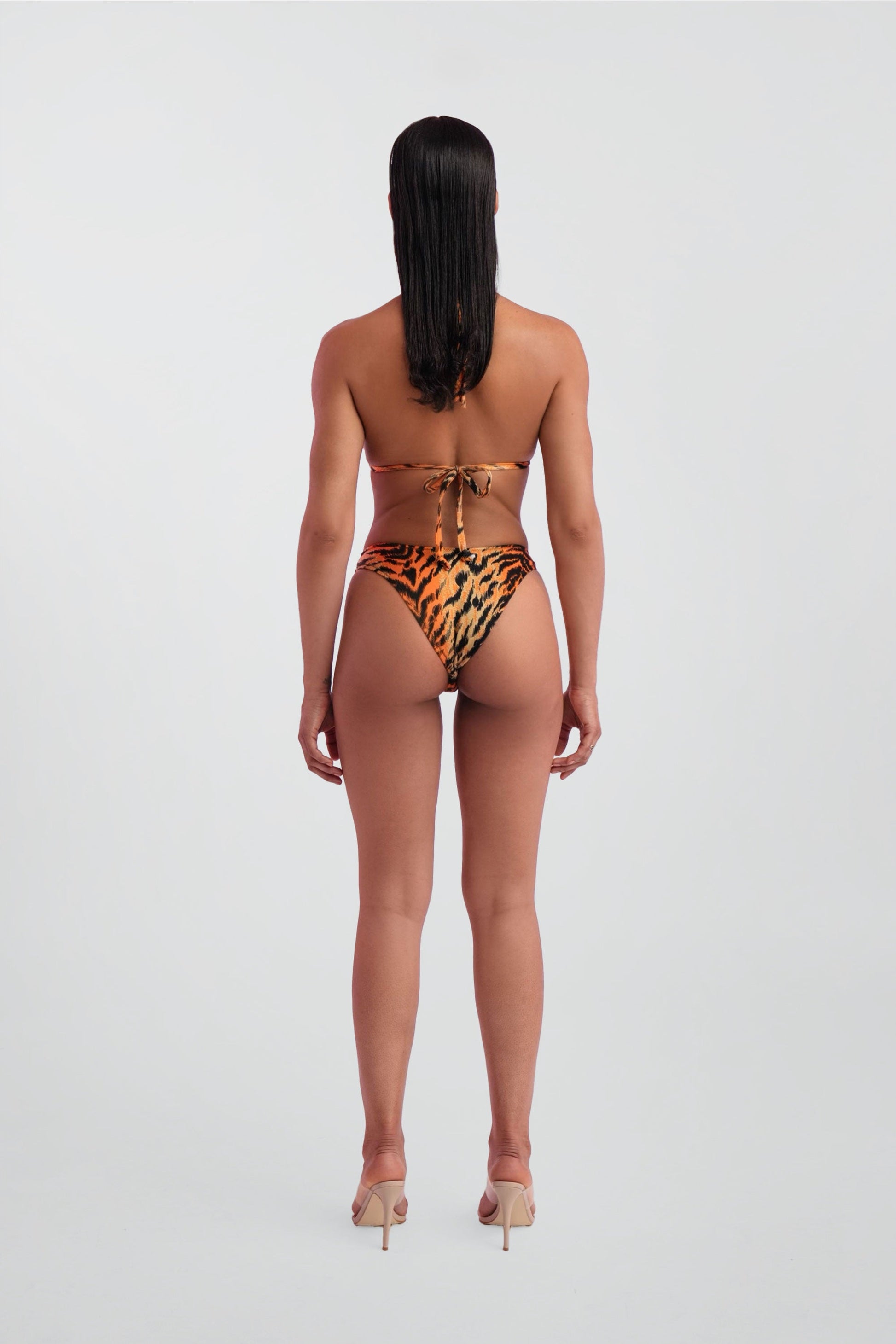 Make a statement with the Talia Bikini in our vibrant orange and black tiger print. Available in two variations, Brazilian or thong-cut bottoms, both paired with a triangle-cut top. The triangle cups feature gold grommet details and drawstrings that tie behind the neck and at the back. Both bottom styles are step-in, with no ties.