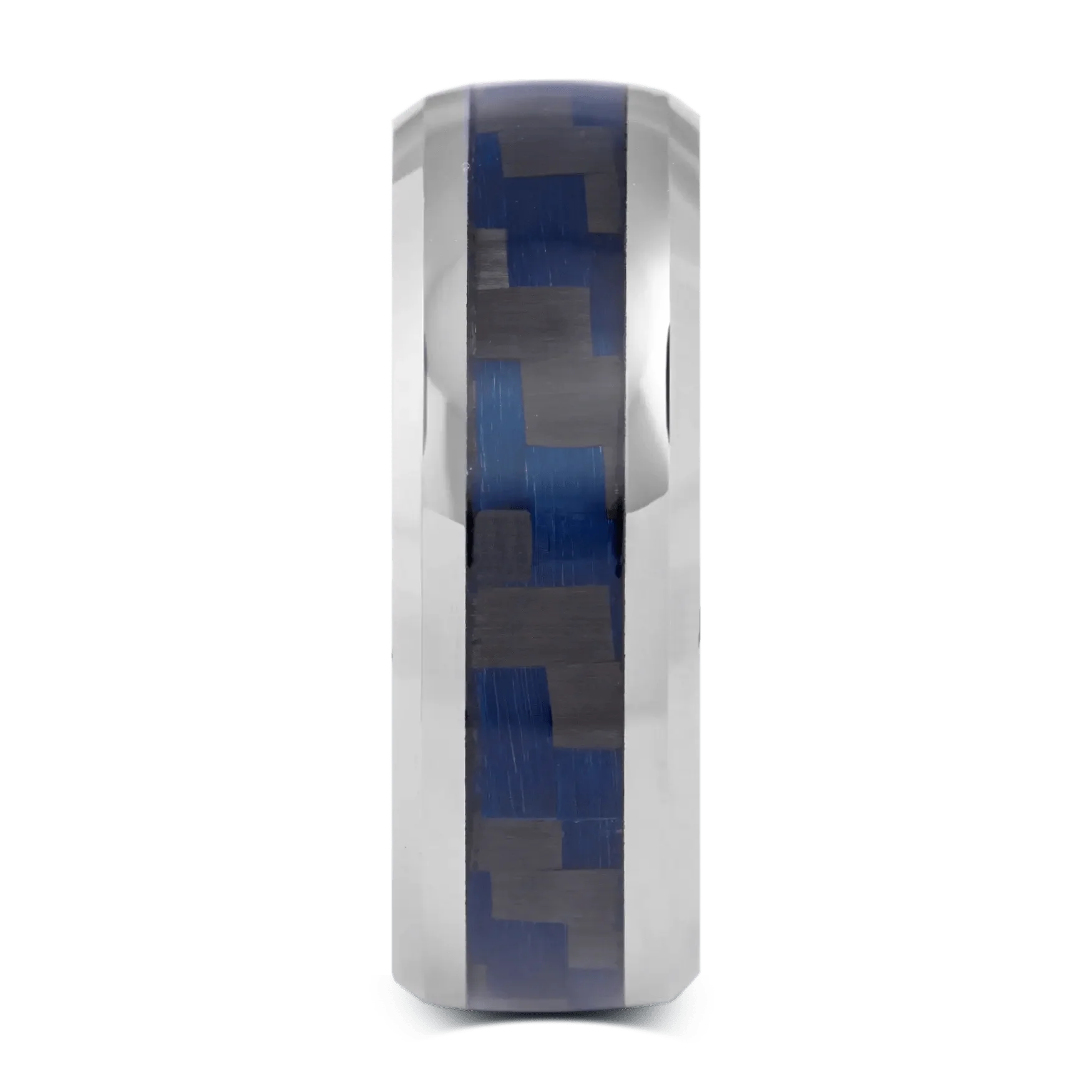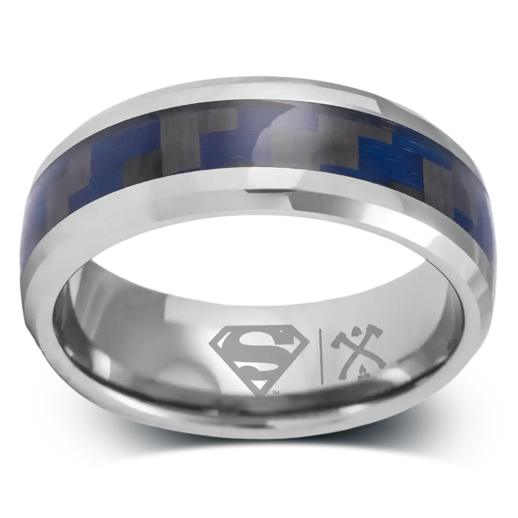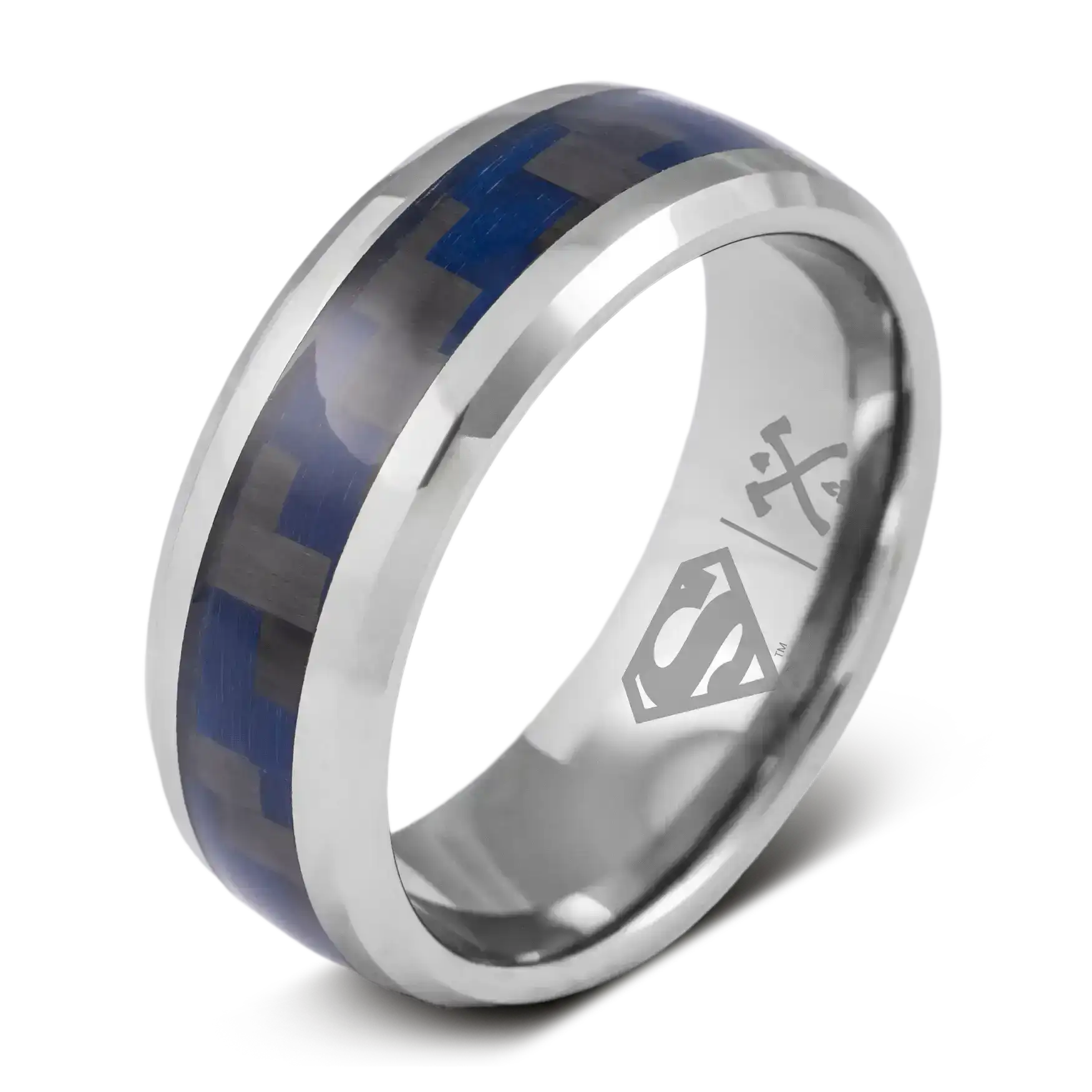 - Tungsten with Blue and Black Carbon Fiber Inlay and Superman Logo Engraving