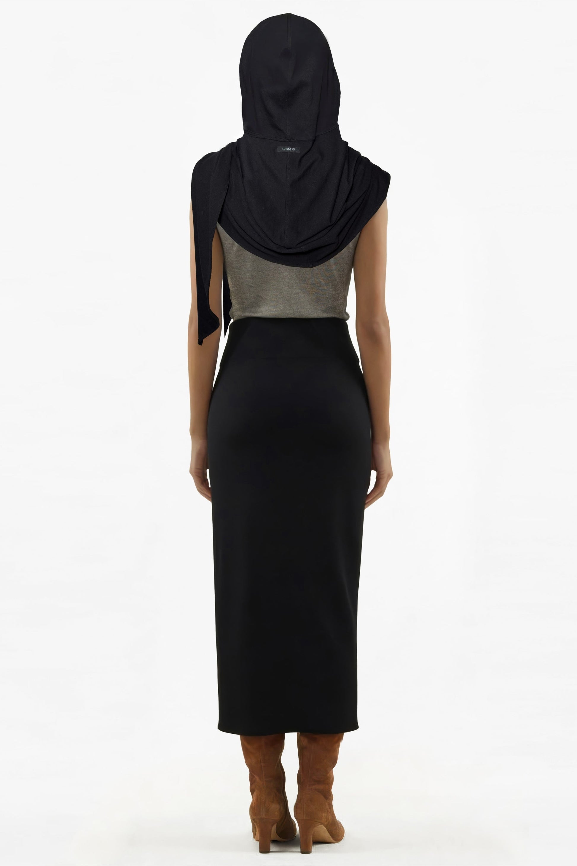 The Halo Hooded Scarf is crafted from our exclusive dual-sided black and gold ponte — a refined, high-performance knit engineered for elegance and protection. Constructed with natural cotton and premium silver fibers, the fabric forms a dense, conductive shield while remaining exceptionally soft, breathable, and fluid against the skin.