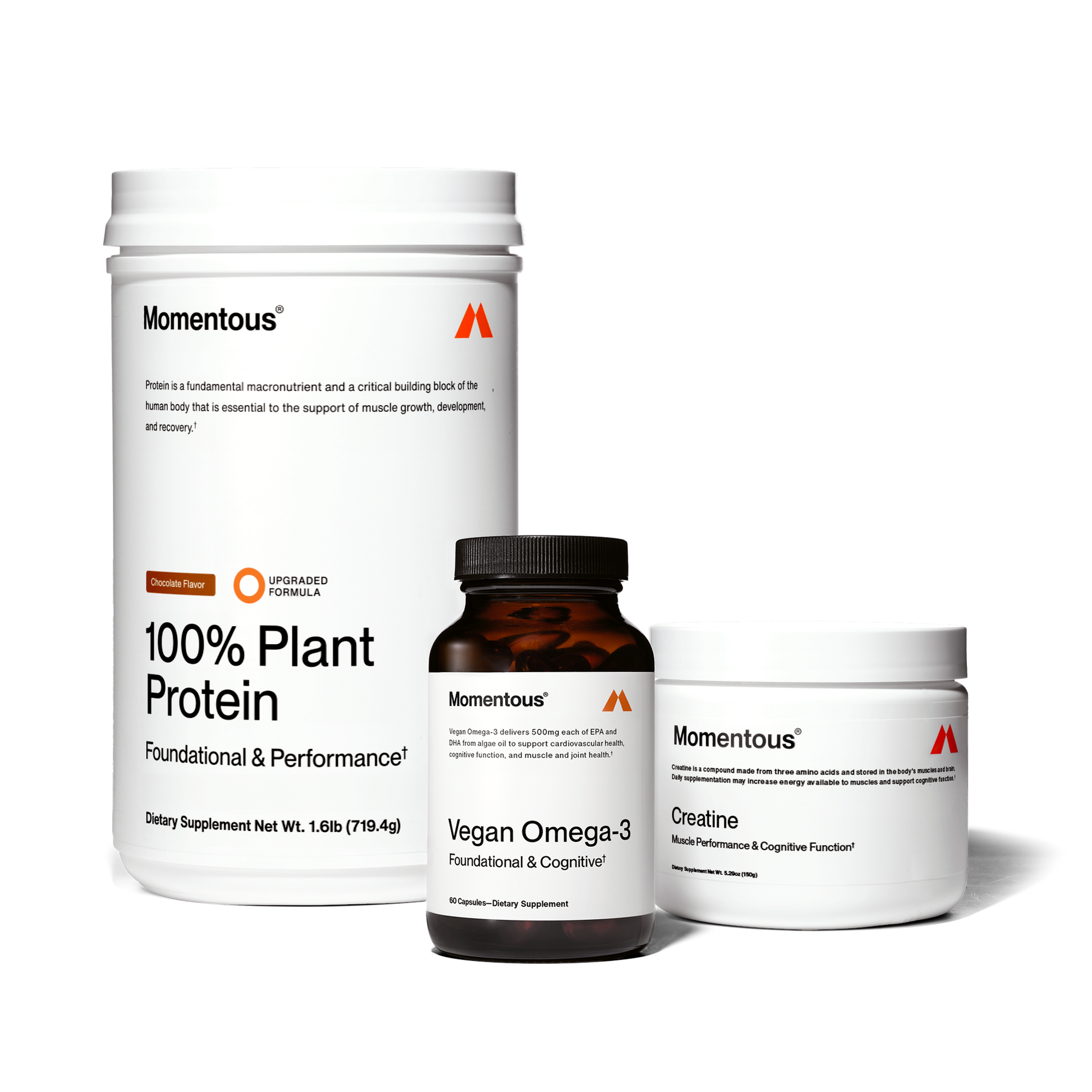 The Momentous Three™: Protein, Creatine, and Omega-3—the 3 nutrients Momentous’ expert ecosystem identified as daily non-negotiables and the biggest impact drivers for longevity of performance and overall health. Each product was developed to meet The Momentous Standard™ of quality, efficacy, and transparency, so you can focus your energy on your goals. Taken daily, this protocol supports muscle strength, growth, and recovery, as well as cognitive function including focus, mental sharpness, and memory recall.