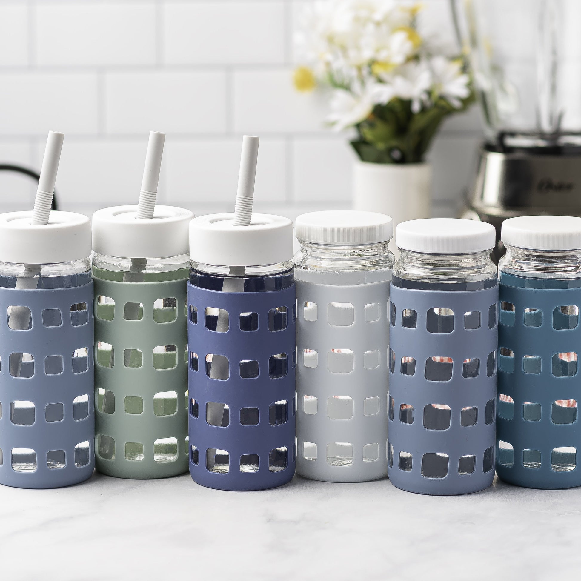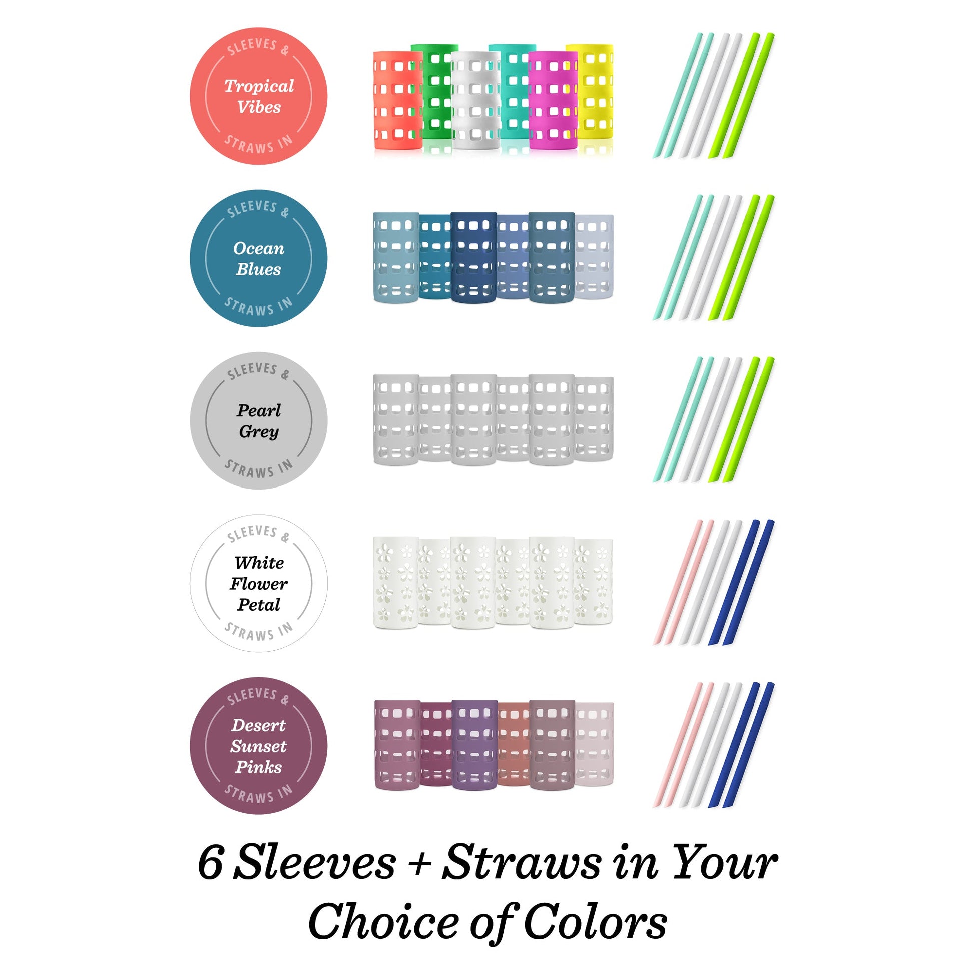 - Set of 6 silicone straws in 3 size widths, colors coordinate with sleeves