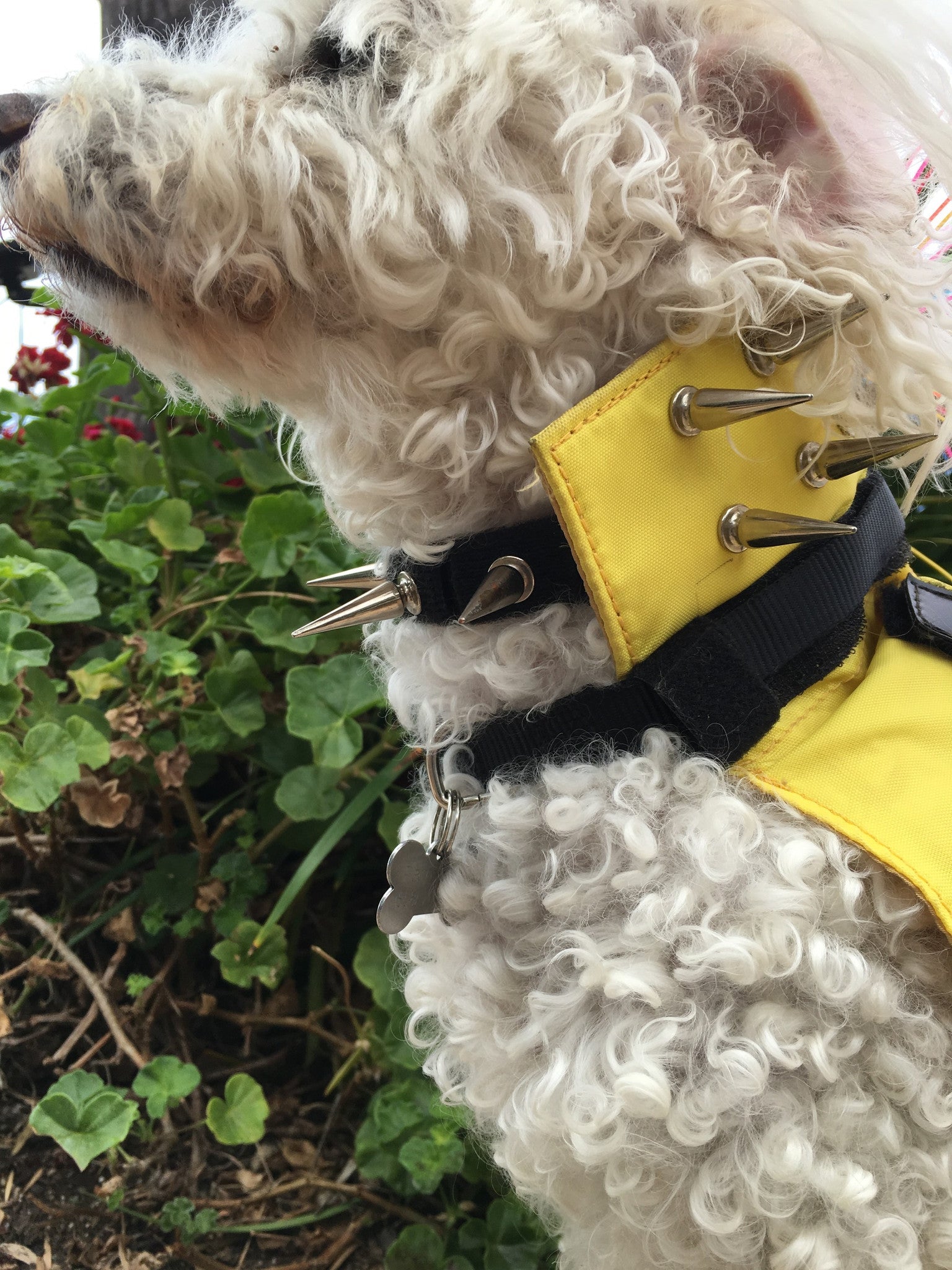 The Throat Guard is very comfortable for your dog to wear and is adjustable to get a perfect snug fit. The Throat Guard is made from a sturdy nylon strap with a plastic snap buckle and removable hard plastic spikes that are chrome-plated,  lightweight, and waterproof. It comes with enough spikes to cover the lower portion of the neck and if necessary you can simply take one or two of the spikes off or change the spacing any way you like.