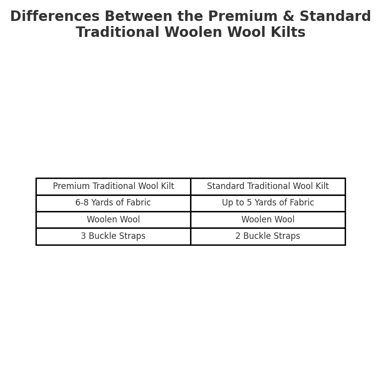 Premium Wool Kilts offer durability, comfort, and an authentic Scottish look. Made from 14-16 oz wool with 6-8 yards of fabric, they provide the perfect kilt swing. Pleated to the sett for a seamless tartan flow and finished with a traditional selvedge edge, these kilts maintain a classic style. A full inner lining adds comfort, while belt loops accommodate accessories.