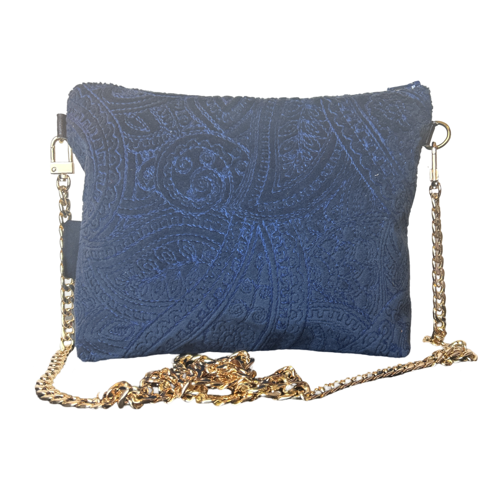 Vintage Dior Trotter scarf front paired with navy blue velvet reverse. Fully lined, zippered closure with removable 23" drop gold-tone crossbody chain.