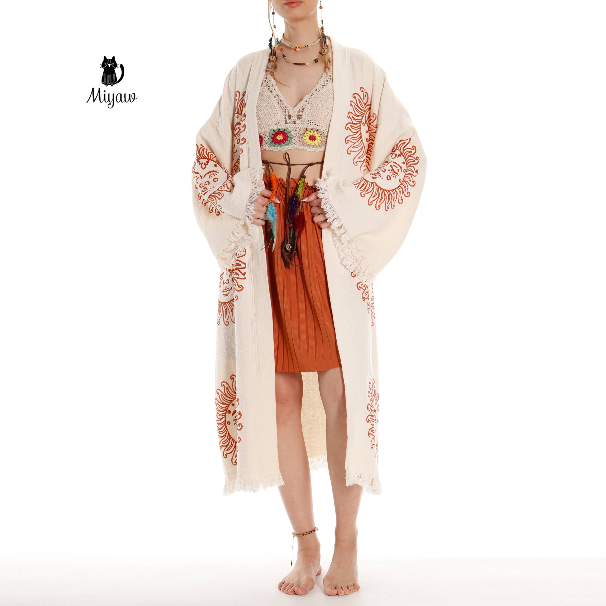 Unique Sun Stamped Robe: Eco-Friendly Organic Cotton Boho Kimono