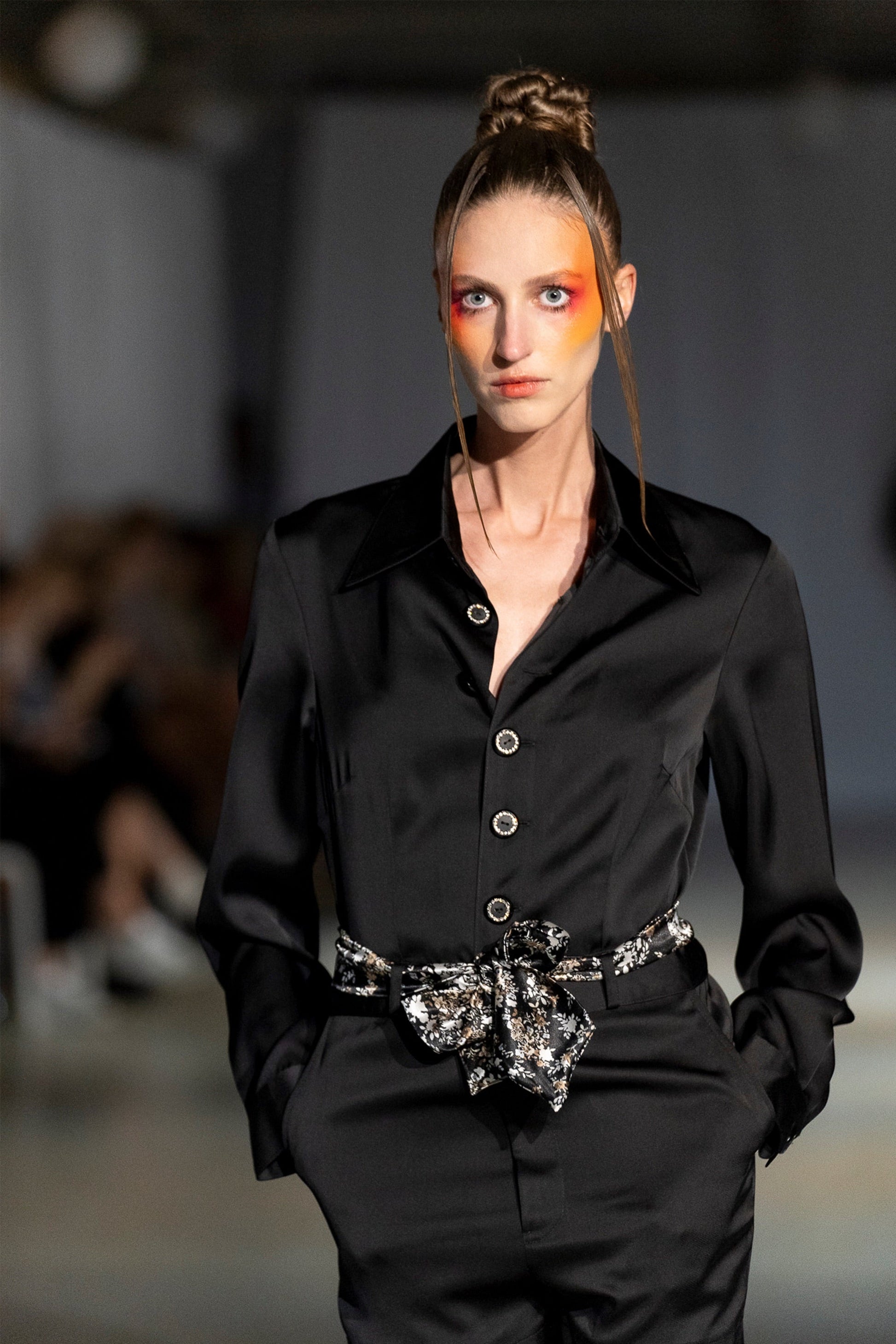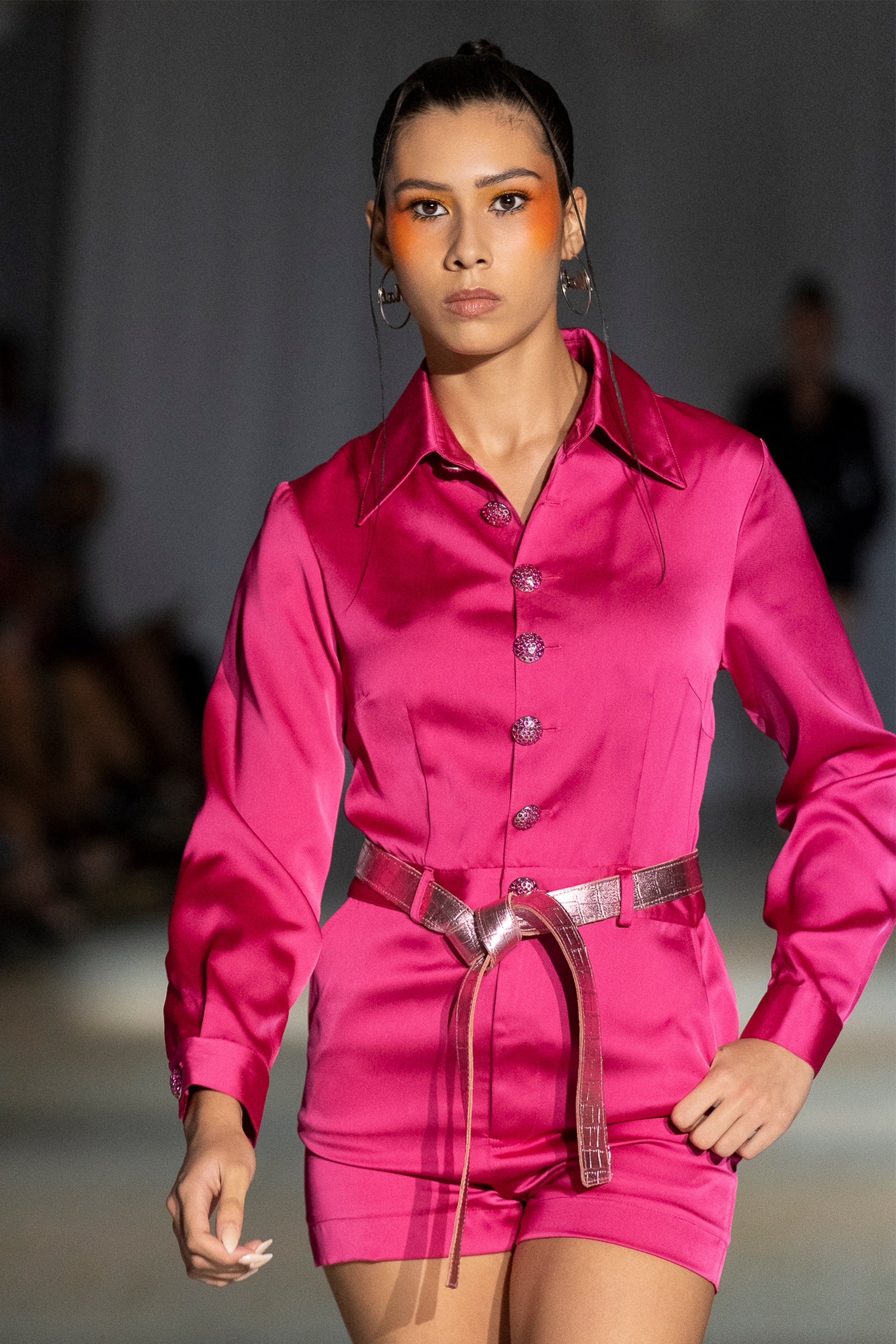 The relaxed yet structured fit drapes effortlessly, while the cinched waistline creates a defined silhouette. Flowing into tailored shorts, the piece balances ease with refinement. Crafted from lustrous polyester satin, the fabric catches the light with a liquid-like sheen, enhancing its sculptural movement.