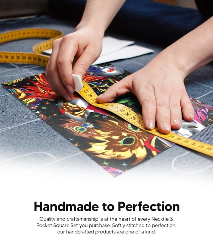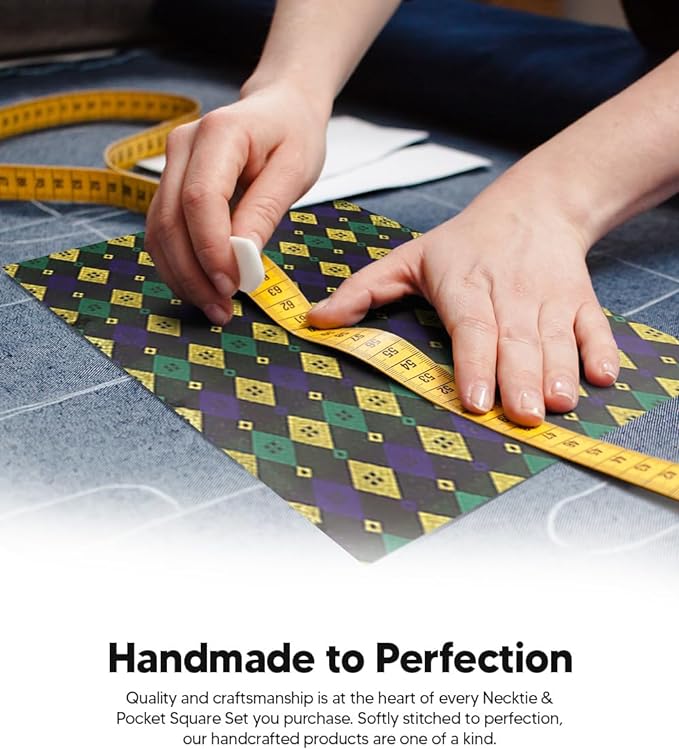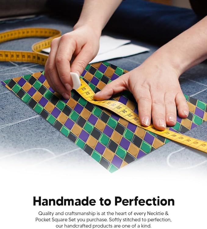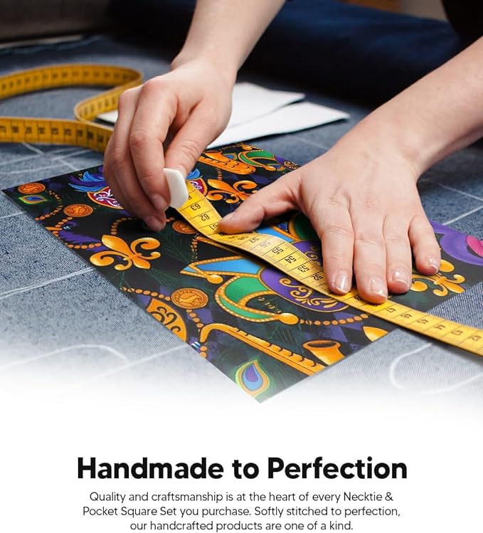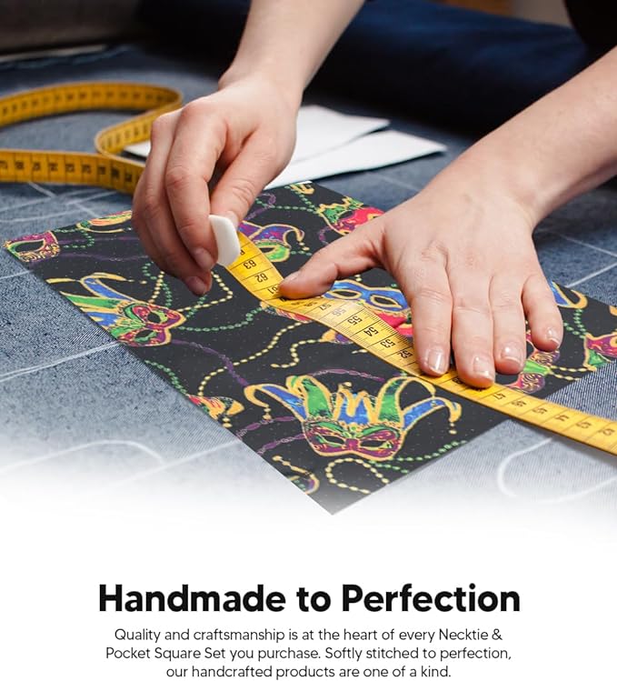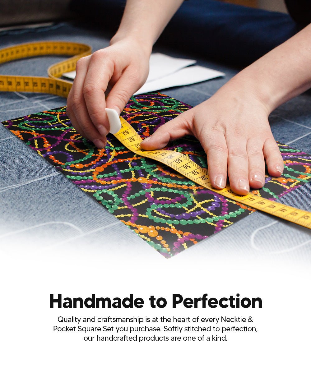 Bring some class and creativity to your wardrobe with this one-of-a-kind Vittorio Farina Custom Collection necktie and pocket handkerchief set. Made out of woven satin, this elegant set features a unique Mardi Gras design, giving it the perfect balance of both exclusiveness and style. This beautiful necktie is custom made with an nice metal plate sewn on the tie keeper and embossed tipping. An excellent choice for any well dressed man who wants to stop the traffic!