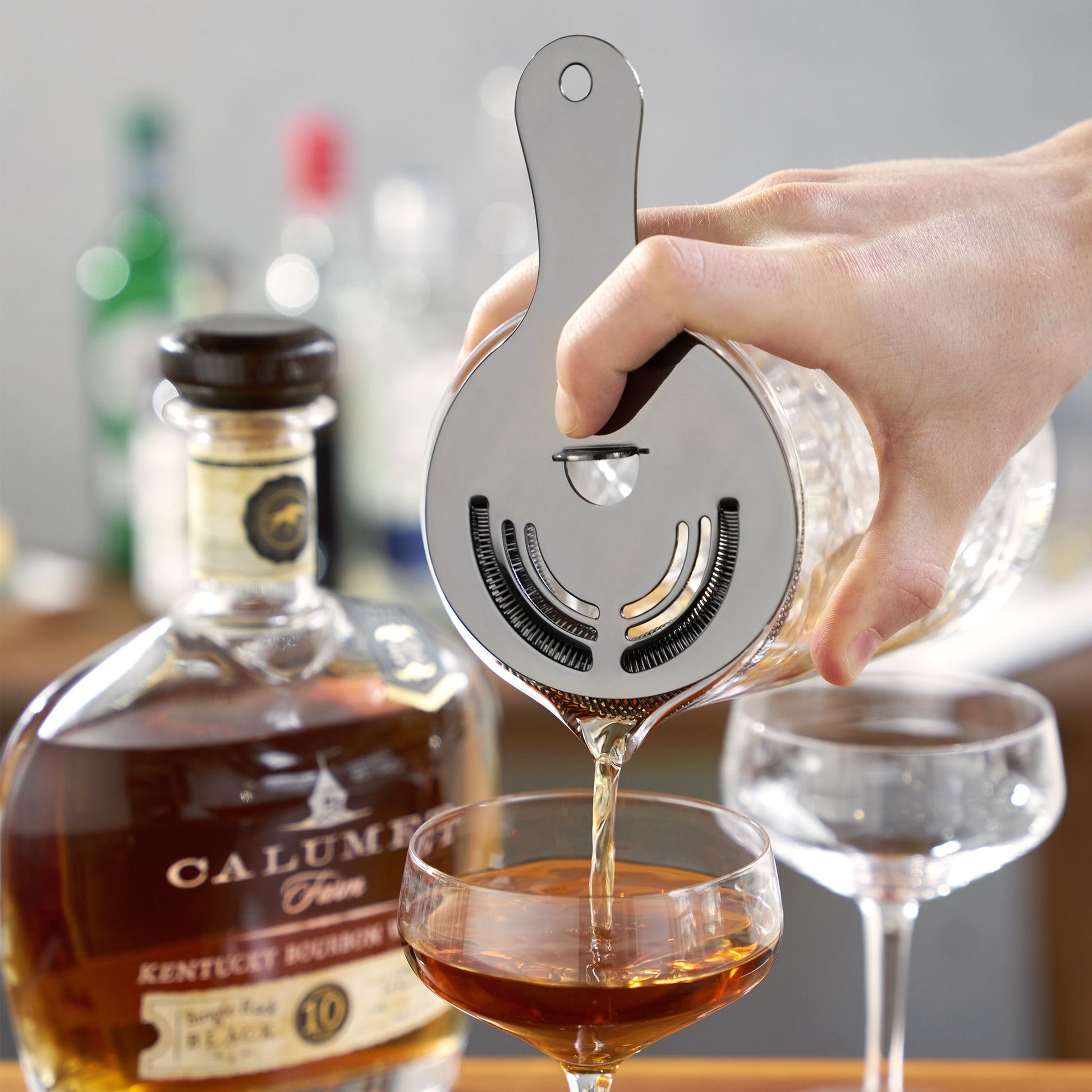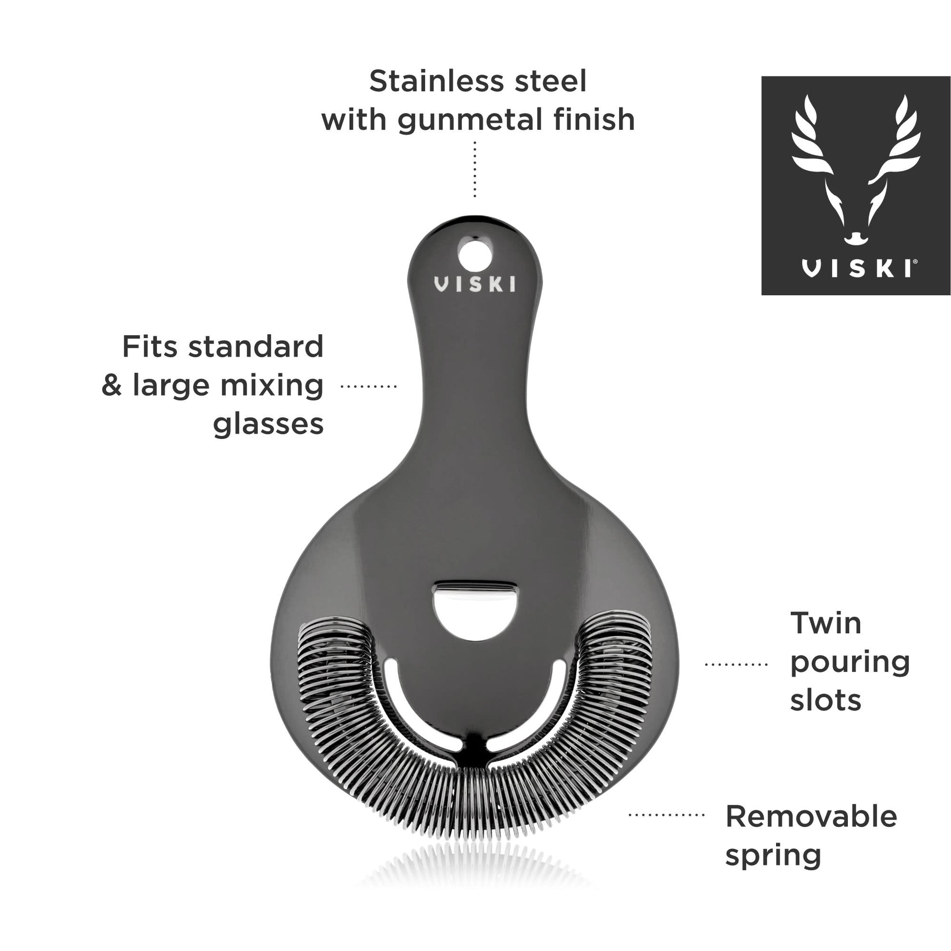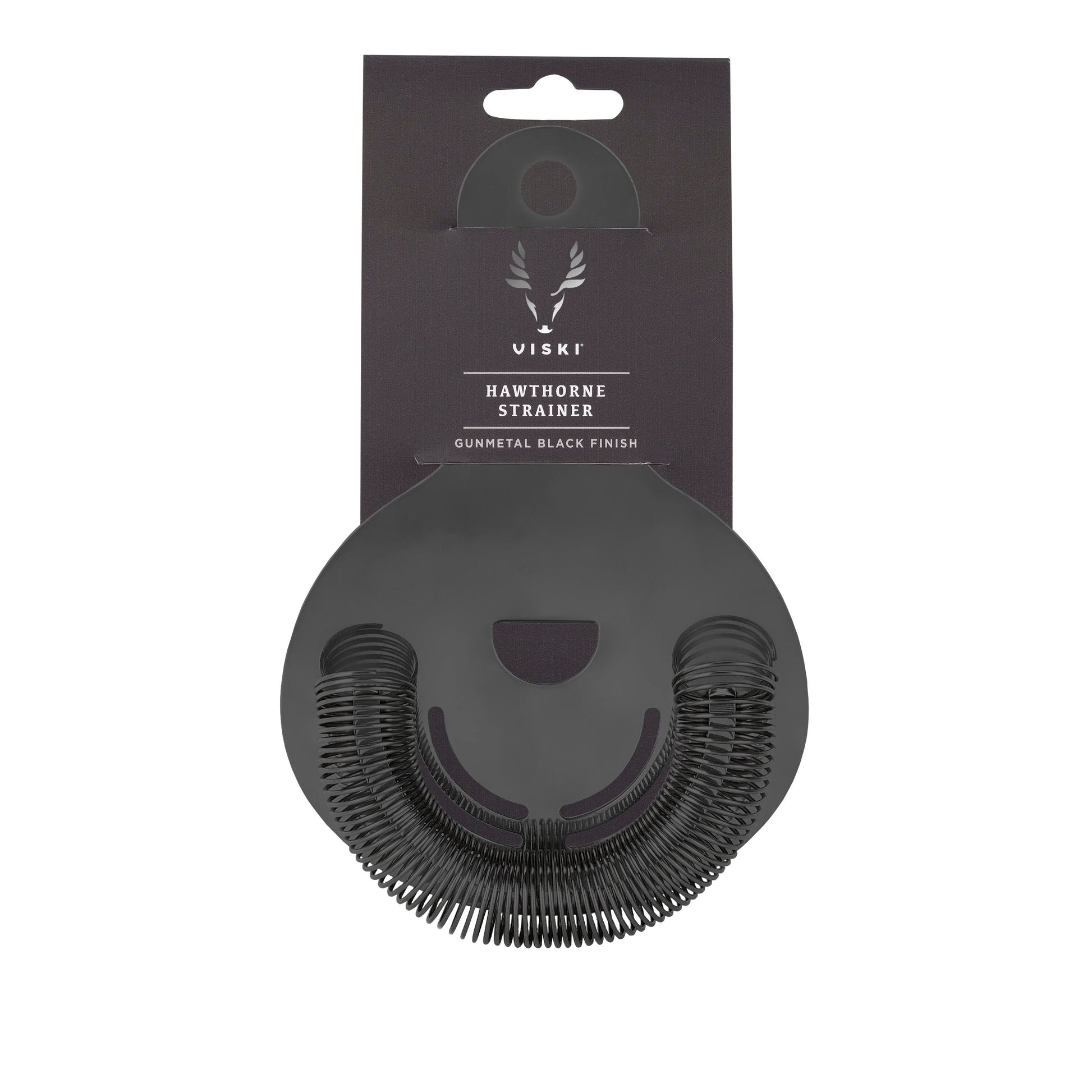 An unobtrusive flat handle, broad face, and tightly coiled spring define our professional-grade gunmetal black Hawthorne strainer, while two symmetrical sets of perforations provide the bonus of making split pours second nature.
