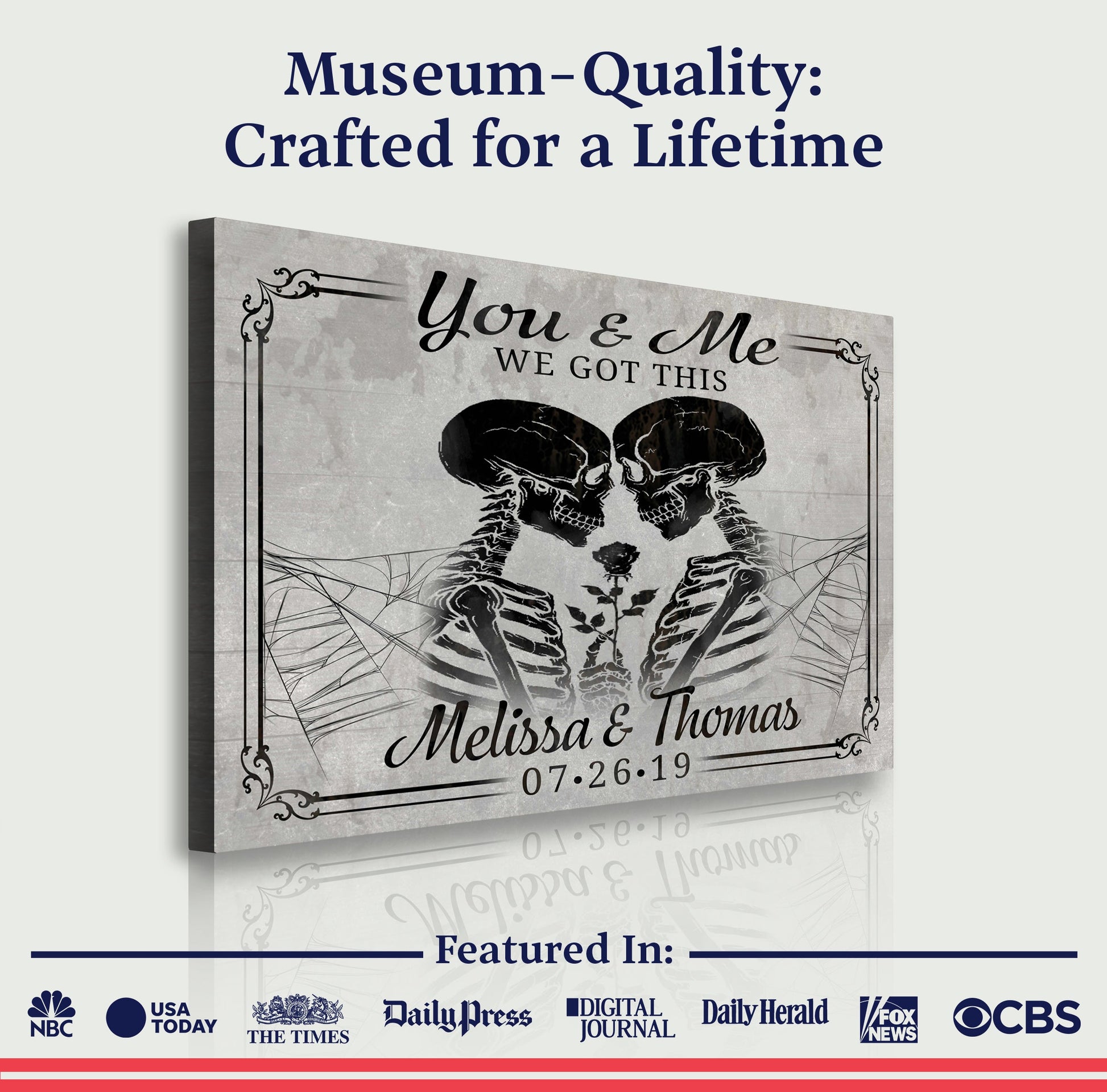 Do you and your significant other like romance and gothic culture? You'll like our We Got This Skeleton Couple sign if that's the case. You may personalize it with a quotation you and your partner adore or the day you two first met. It features a skeleton couple in love. It may be given as a Valentine's Day gift or hung in the bedroom above the bed. Regardless, our We Got This Skeleton Couple canvas print is undoubtedly a special approach to conveying your emo personality and affection for your significant other. Create your own today; we know you'll love it!