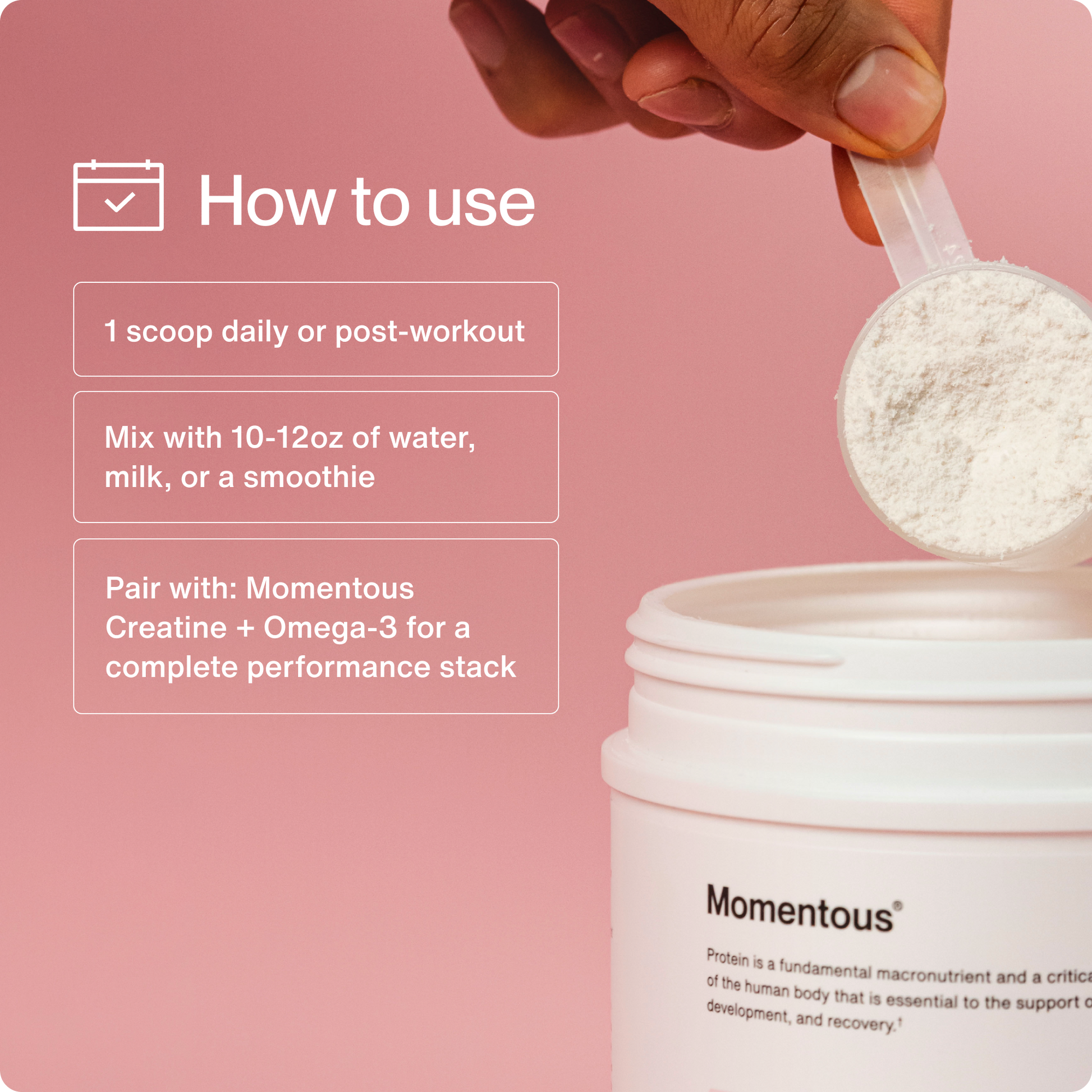 Momentous Whey Protein Isolate has long been trusted by those striving for more; backed by The Momentous Standard™, our #1 product delivers the highest quality ingredients and flavors with no compromise—no artificial ingredients, sweeteners, gums or fillers, just naturally-flavored options to keep your protein routine easy and fresh.
