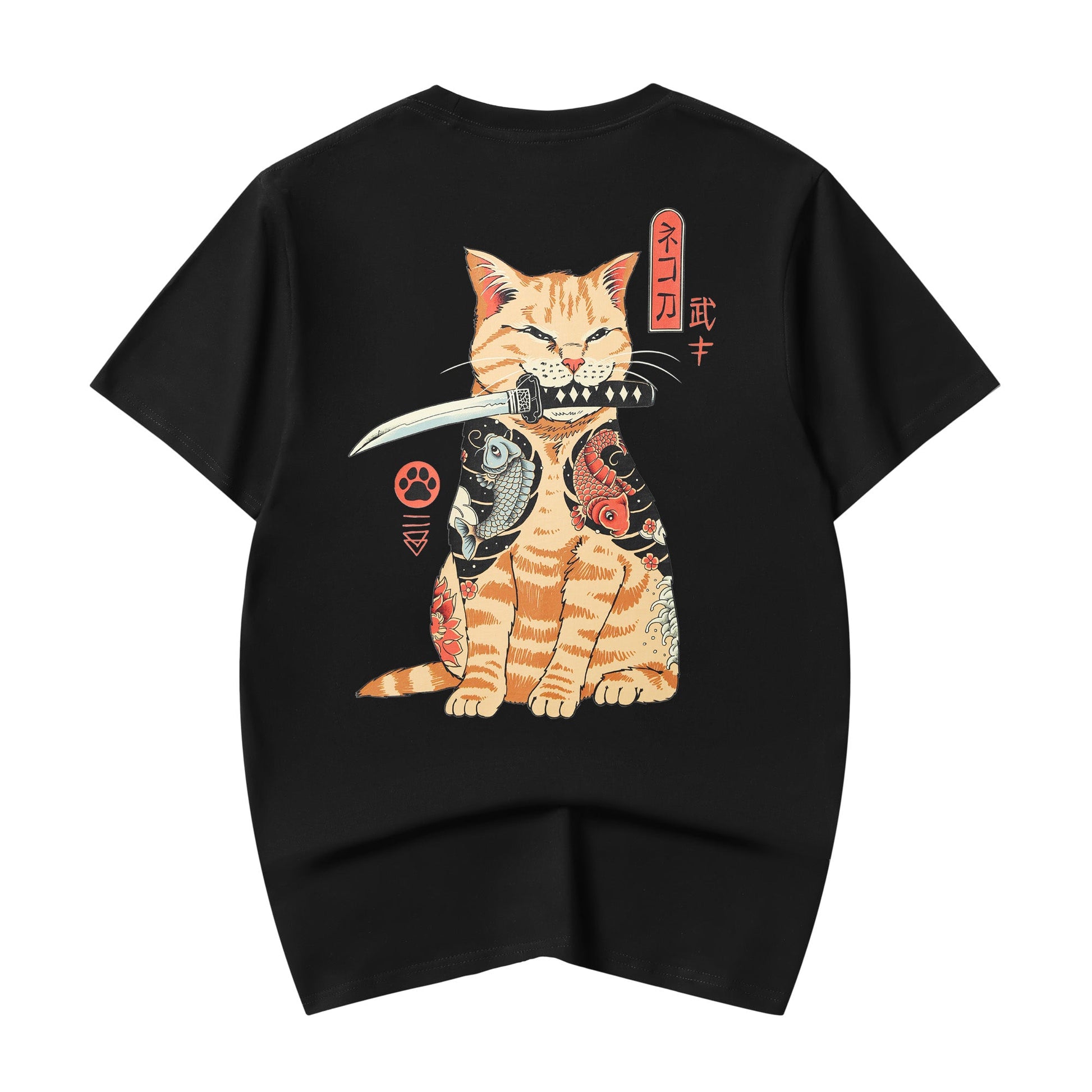 - The short sleeve t-shirt features a Japanese samurai cat holding a knife in its mouth with tatoos on each arm
