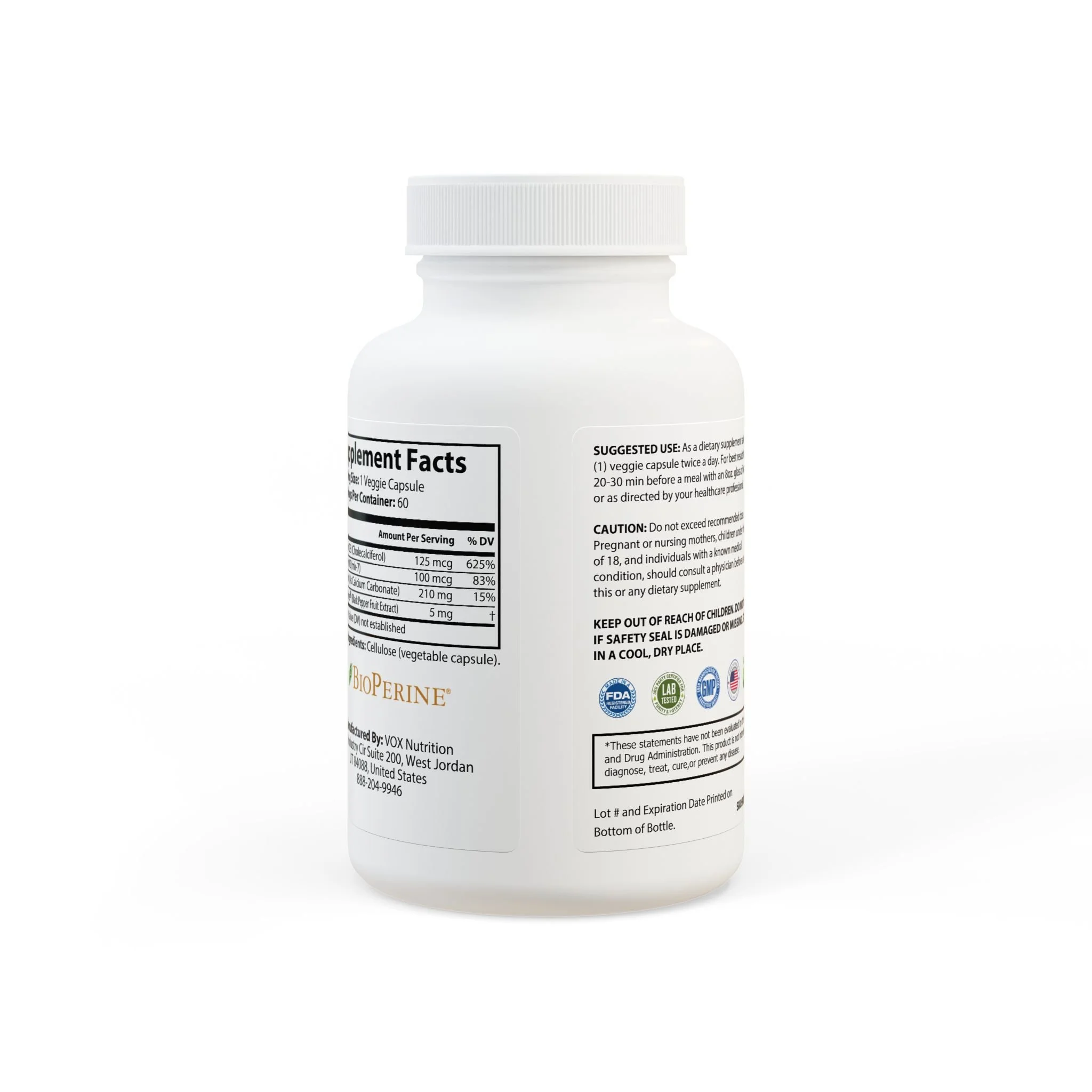 Ingredients: Vitamin D3 (Cholecalciferol), Vitamin K2 (mk-7), Calcium (As Calcium Carbonate), BioPerine ®(Black Pepper Fruit Extract). Other Ingredients: Cellulose (vegetable capsule).